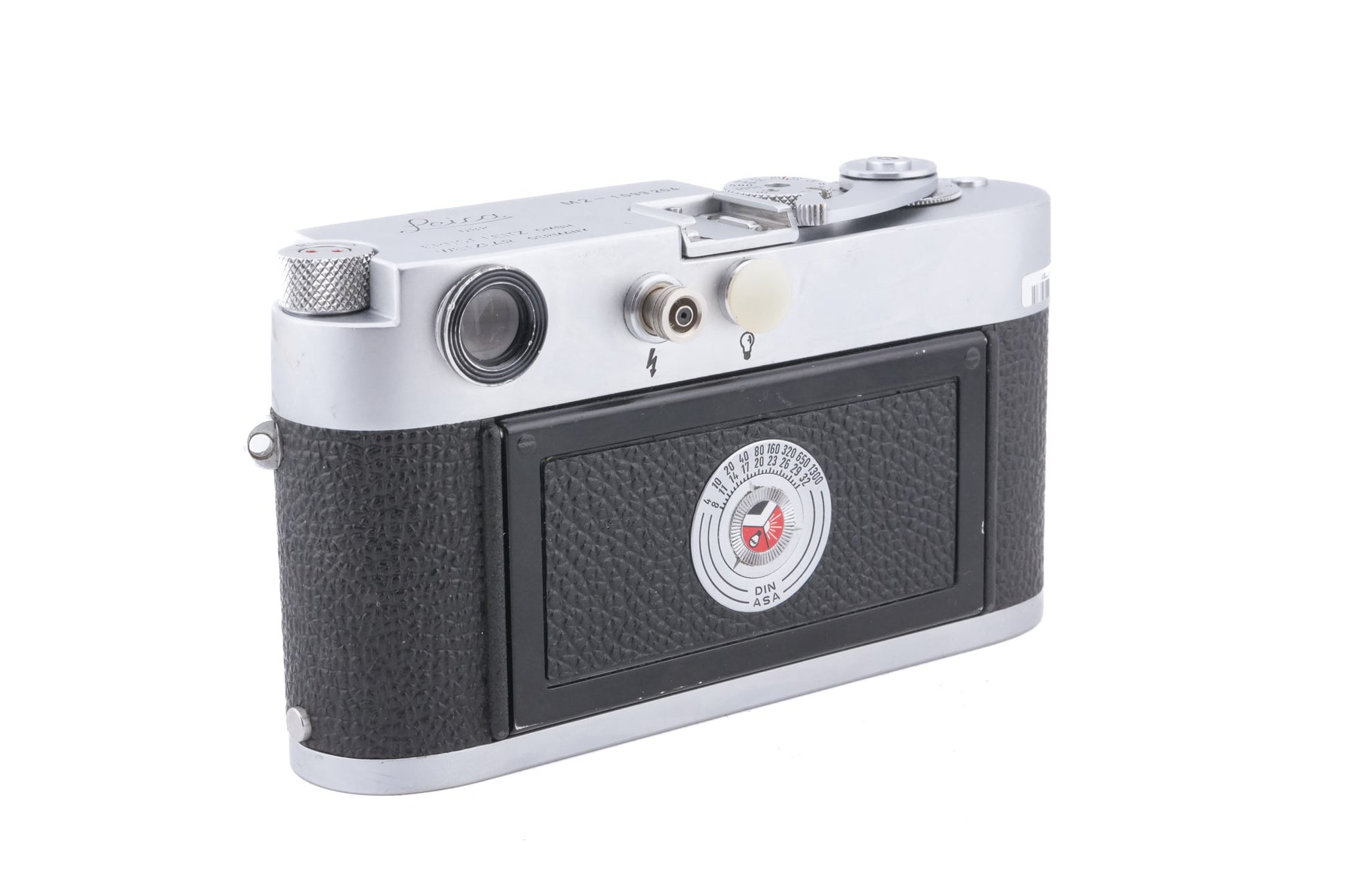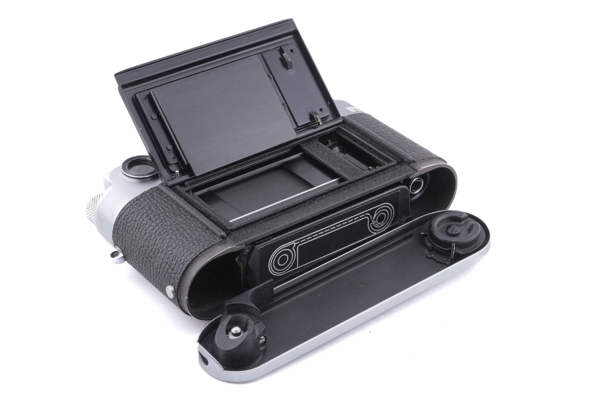 Manual focus M-mount 35mm rangefinder camera introduced by Leica in 1957. It was intended as a lower-cost alternative to the single-stroke M3. At launch, it was available without a self-timer, had an externally manually reset frame counter, a button rewind, and a 0.72x viewfinder with frame lines for 35mm, 50mm, and 90mm lenses. It became very popular due to its wide magnification finder and was known as the "wide-angle" Leica. The M2 experienced many changes over the production period and was given multiple designations to differentiate the models. The deciding factor for the designations was the presence, or lack of, a self-timer. This is the second version of the camera introduced in 1958, and was manufactured with a self-timer. This model has become known in catalogues as the M2S. Another significant change happened in 1958, when the button rewind was changed to a lever akin to the M3. This version with a self-timer was, however, only manufactured with the lever rewind. Metal body available in silver (KOOHW / 10308).