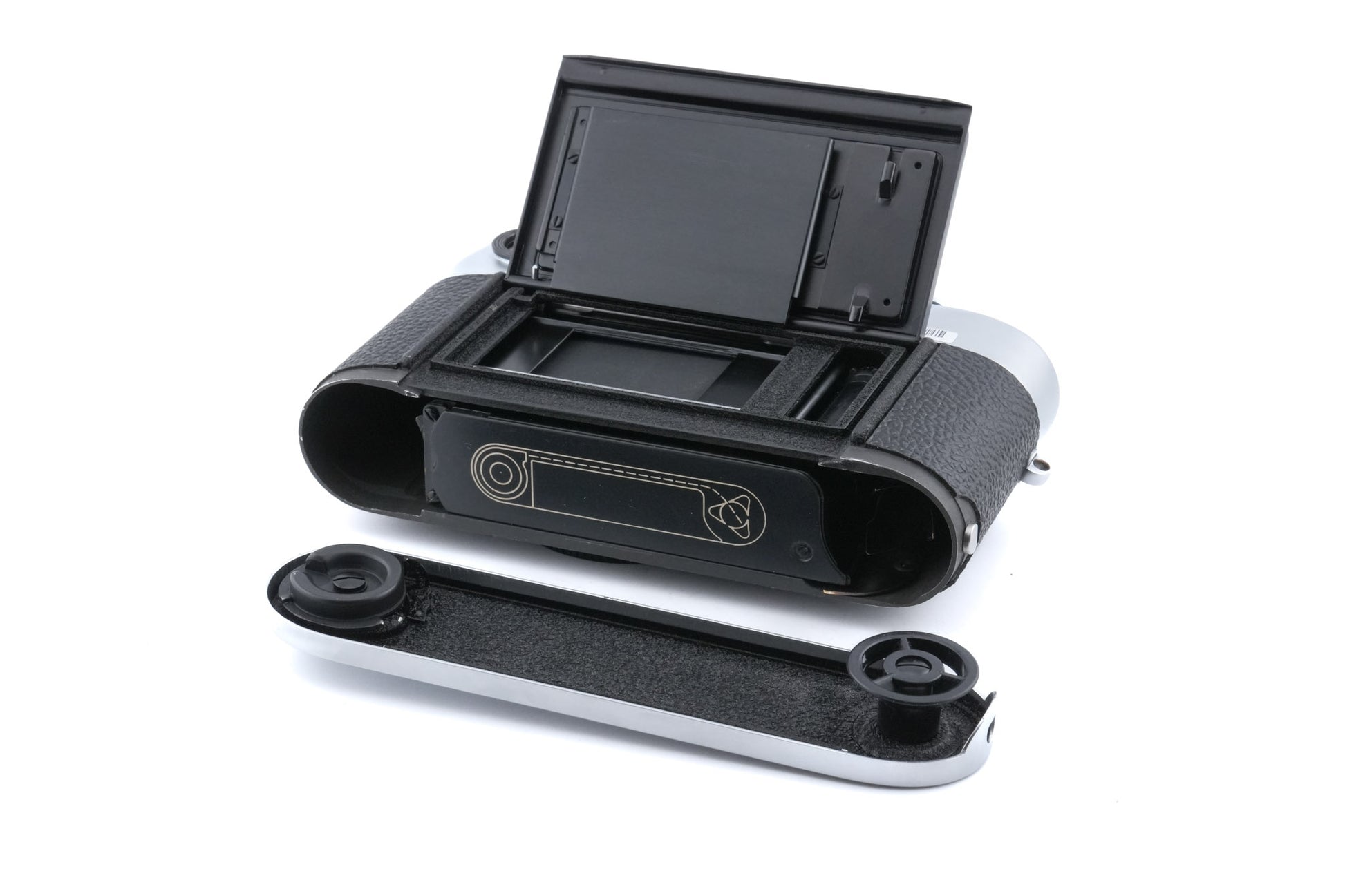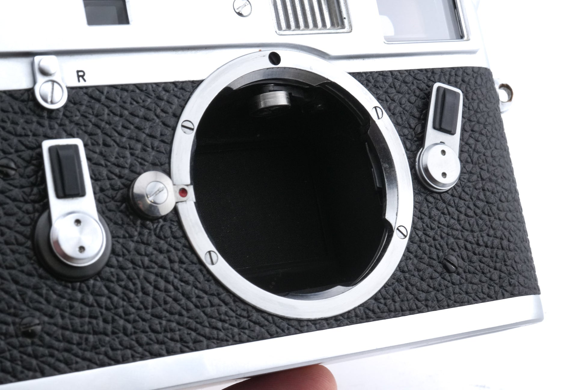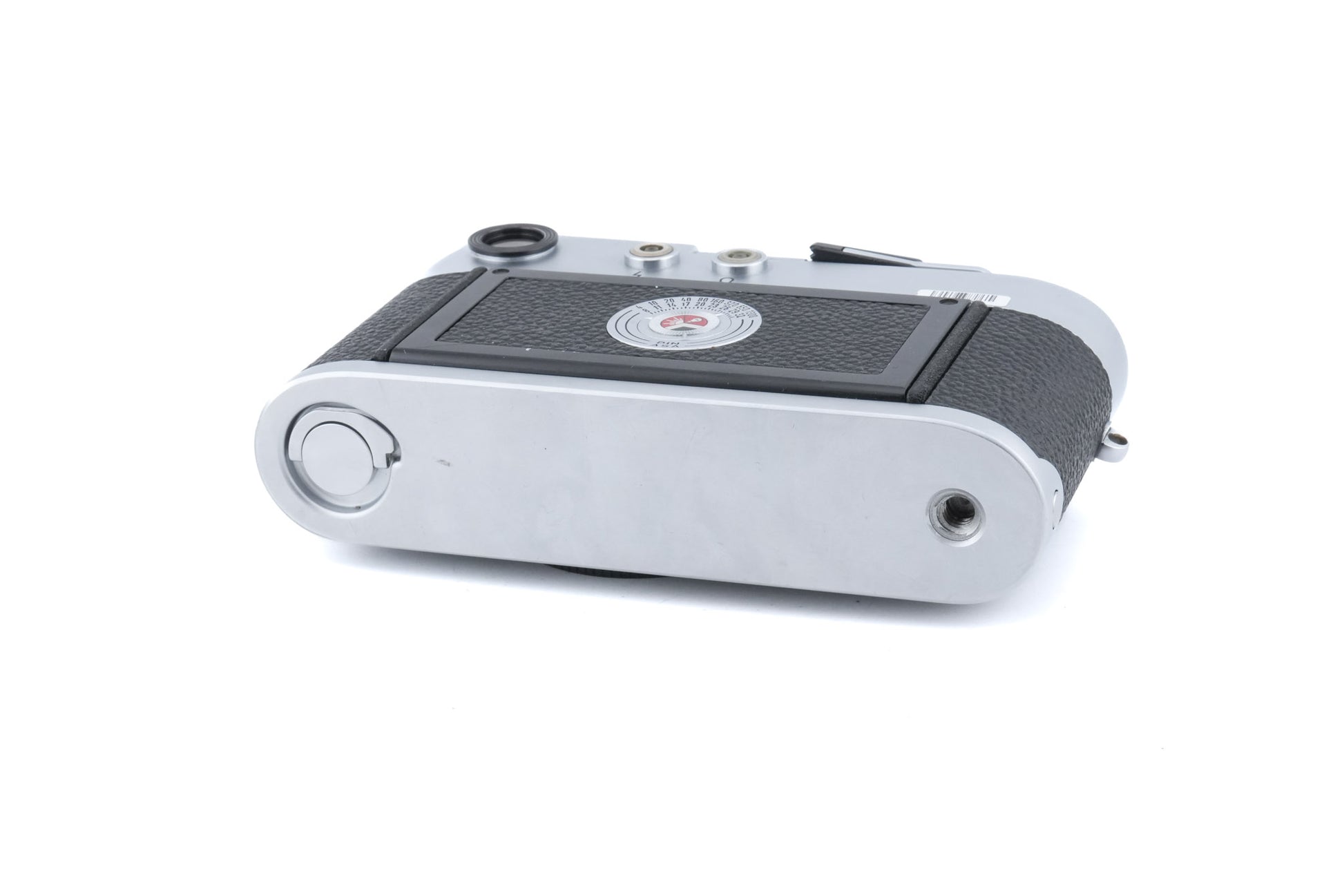 Manual focus M-mount 35mm rangefinder camera introduced by Leica in 1967. This camera replaced the M3 and M2, combining their features into one. It has a 0.72x magnification viewfinder with frame lines for 35mm, 50mm, 90mm, and 135mm focal lengths. It was the first camera to feature Leica’s quick-load mechanism and quicker rewinding knob. Metal body available in silver (10400).