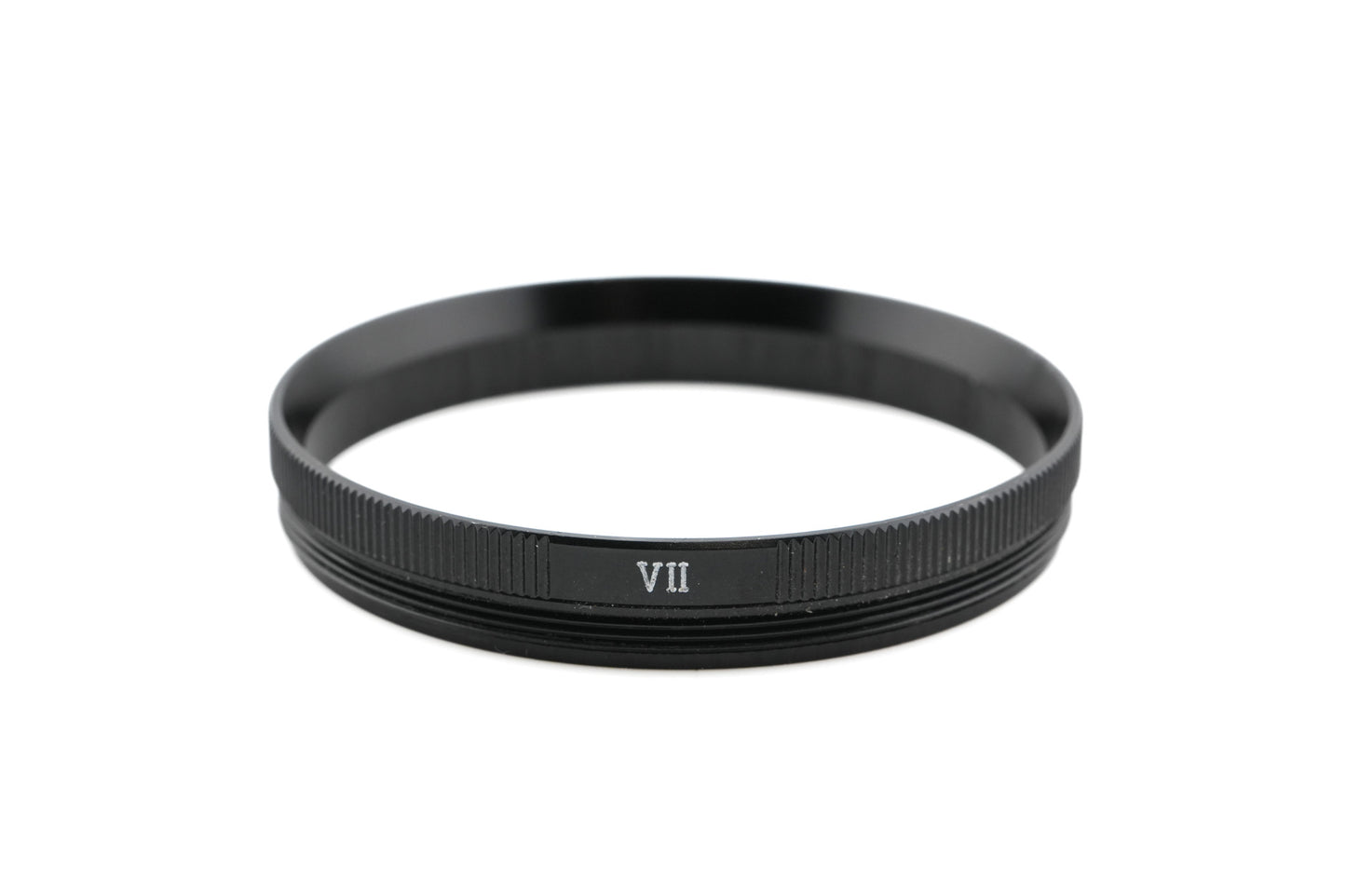 Retaining ring for Series 7 VII filters. Series filters are glass disks mounted in a threadless metal rim. They are attached to the lens with (an adapter and) a retaining ring. Metal construction in black.