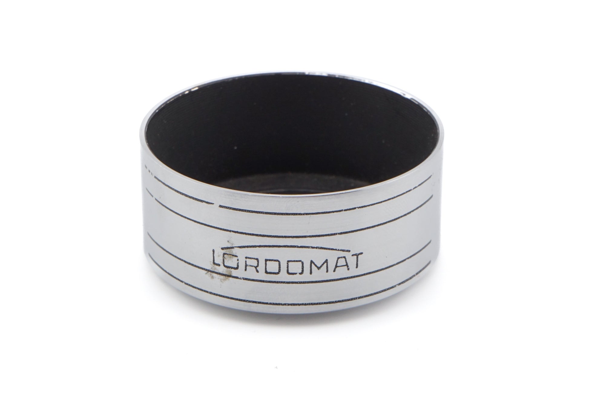 Lens hood with "Lordomat" branding on it. Metal construction in chrome finish.
