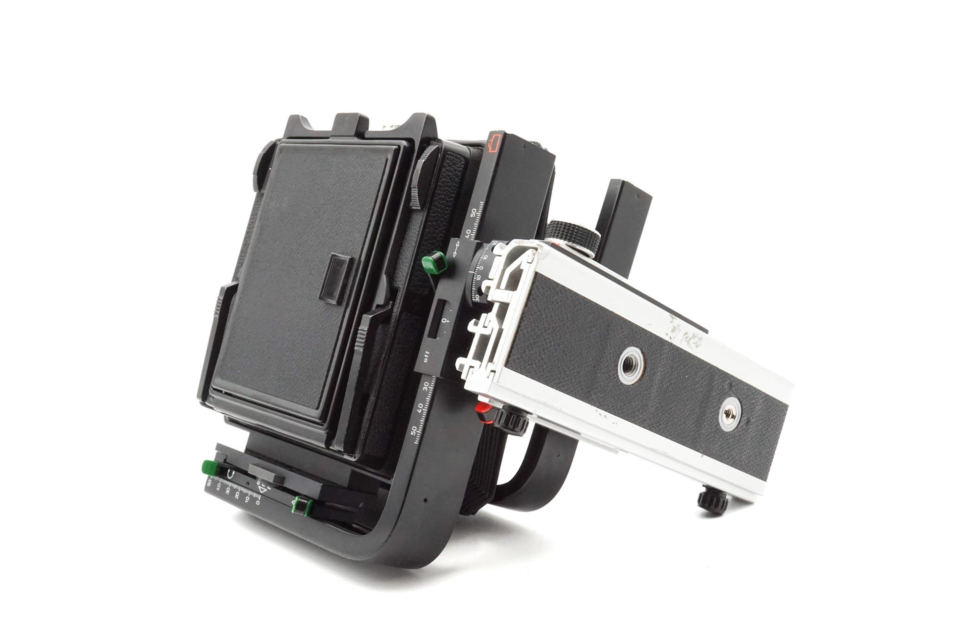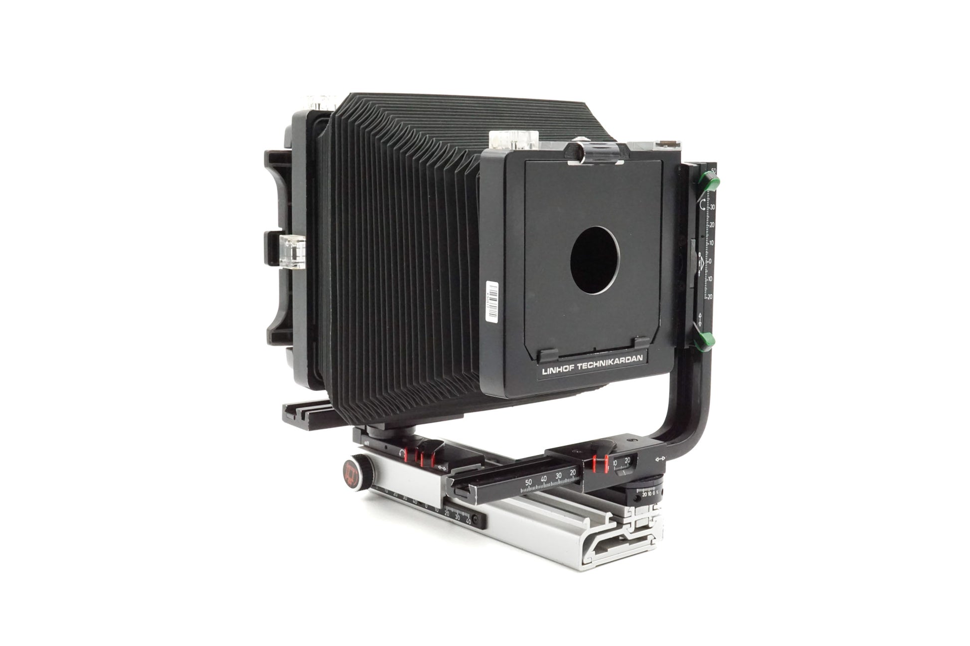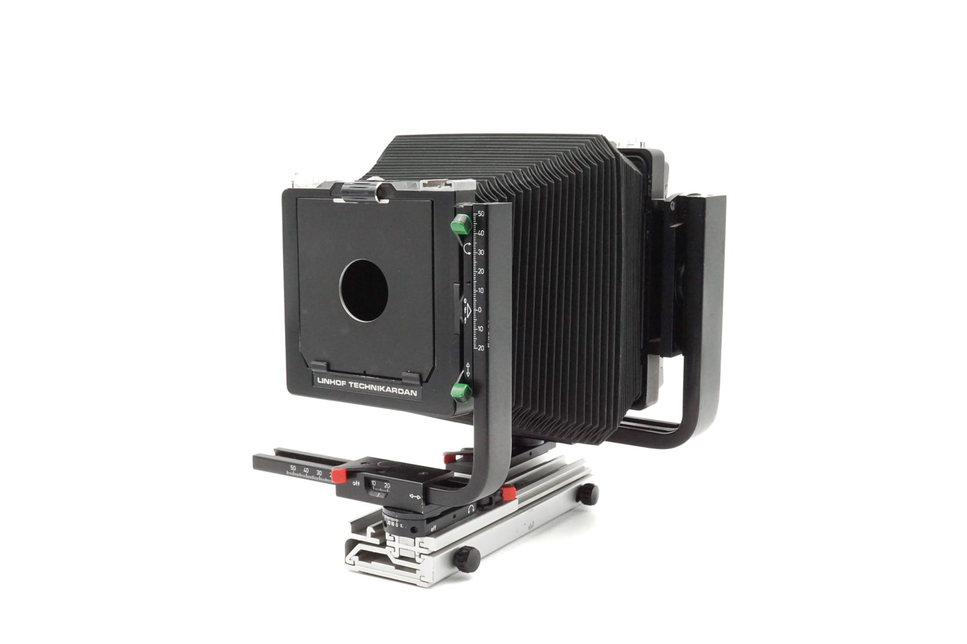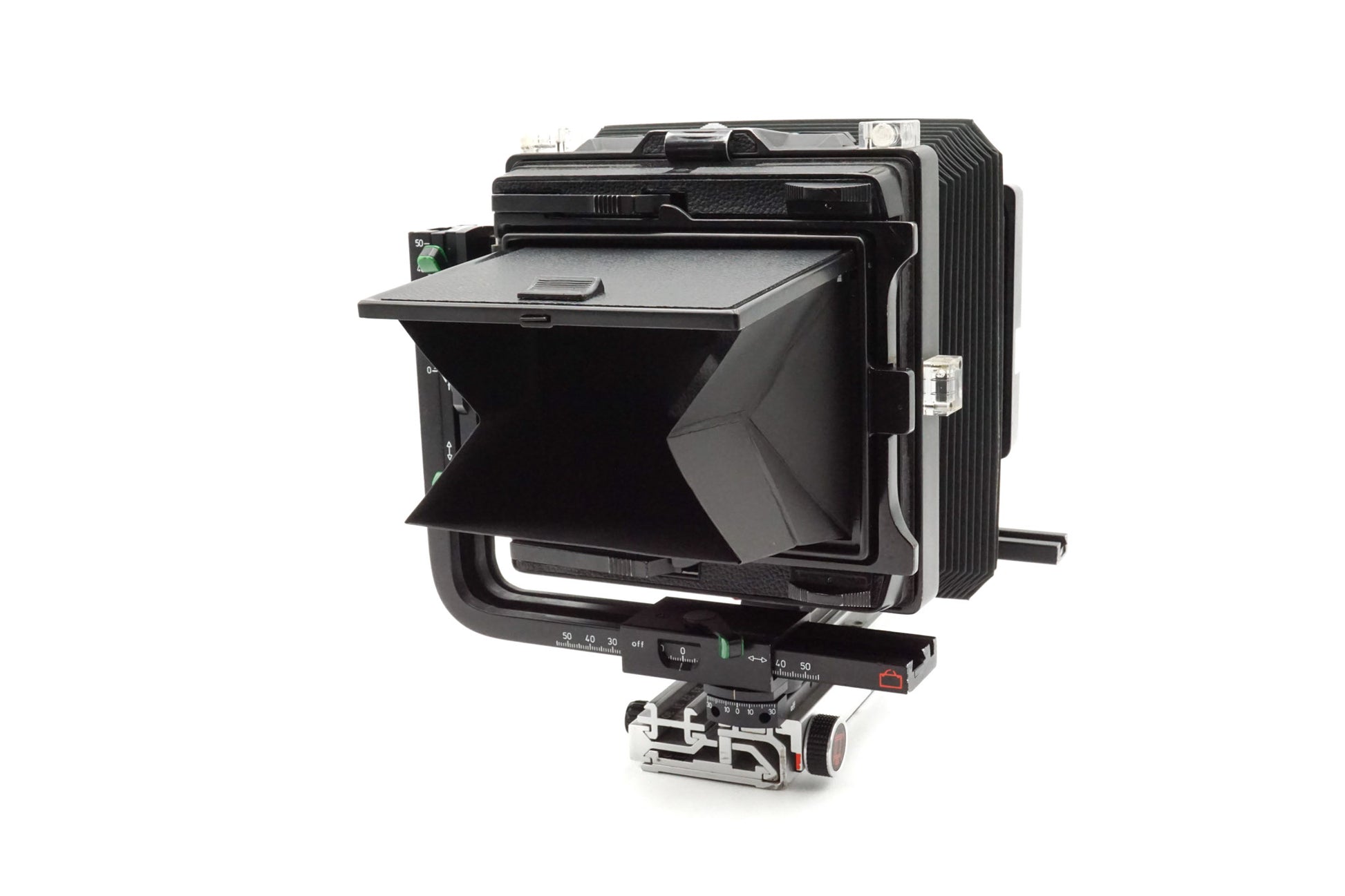 - Rear movements: Rise 50mm, right/left shift 55mm, swing +/-30° (scale), center tilt +/-10°