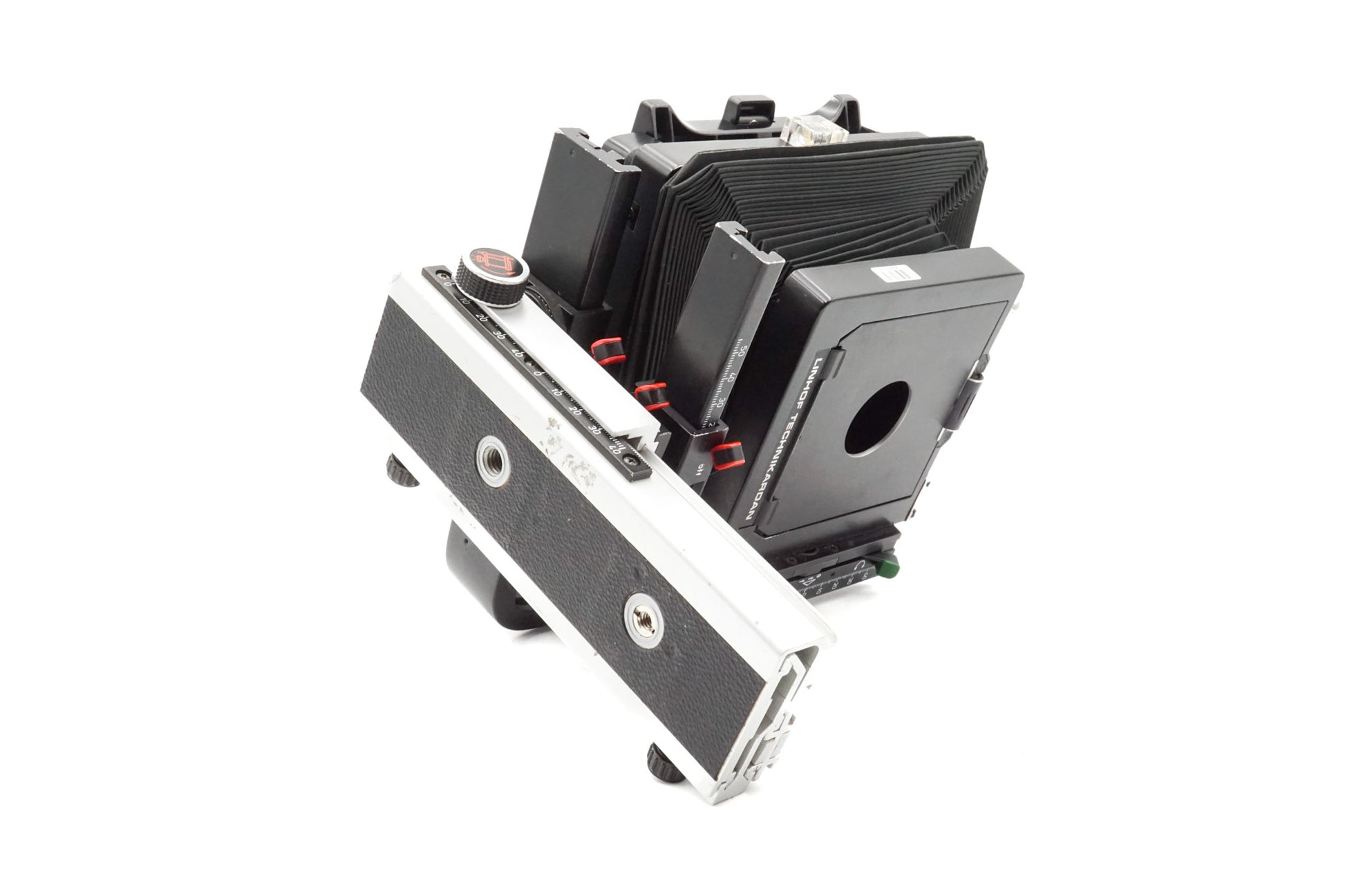 4x5 large format monorail field camera made by Linhof. Extremely versatile and compact for its features. Bellows extension from ~60 to 480mm. Metal body available in black and silver grey finish.