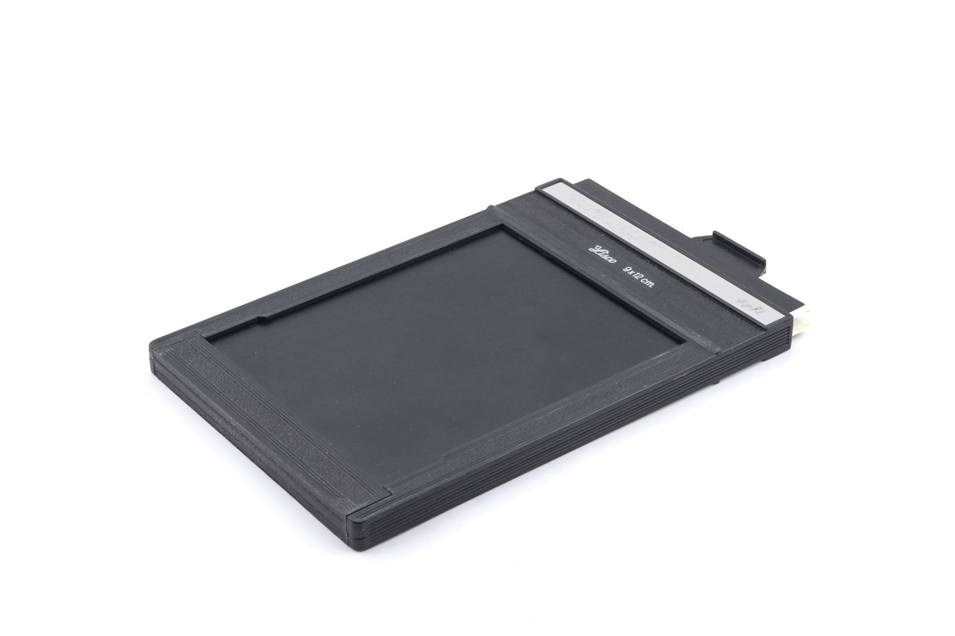 9x12 cm sheet film holder made by Lisco. Each holder can hold two sheets of film, one on each side. Plastic body available in black.