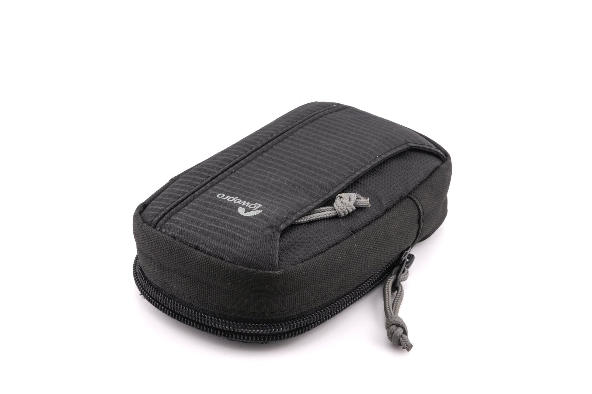 Small bag made by Lowepro. It fits one point-and-shoot camera. Fabric body available in black and red.