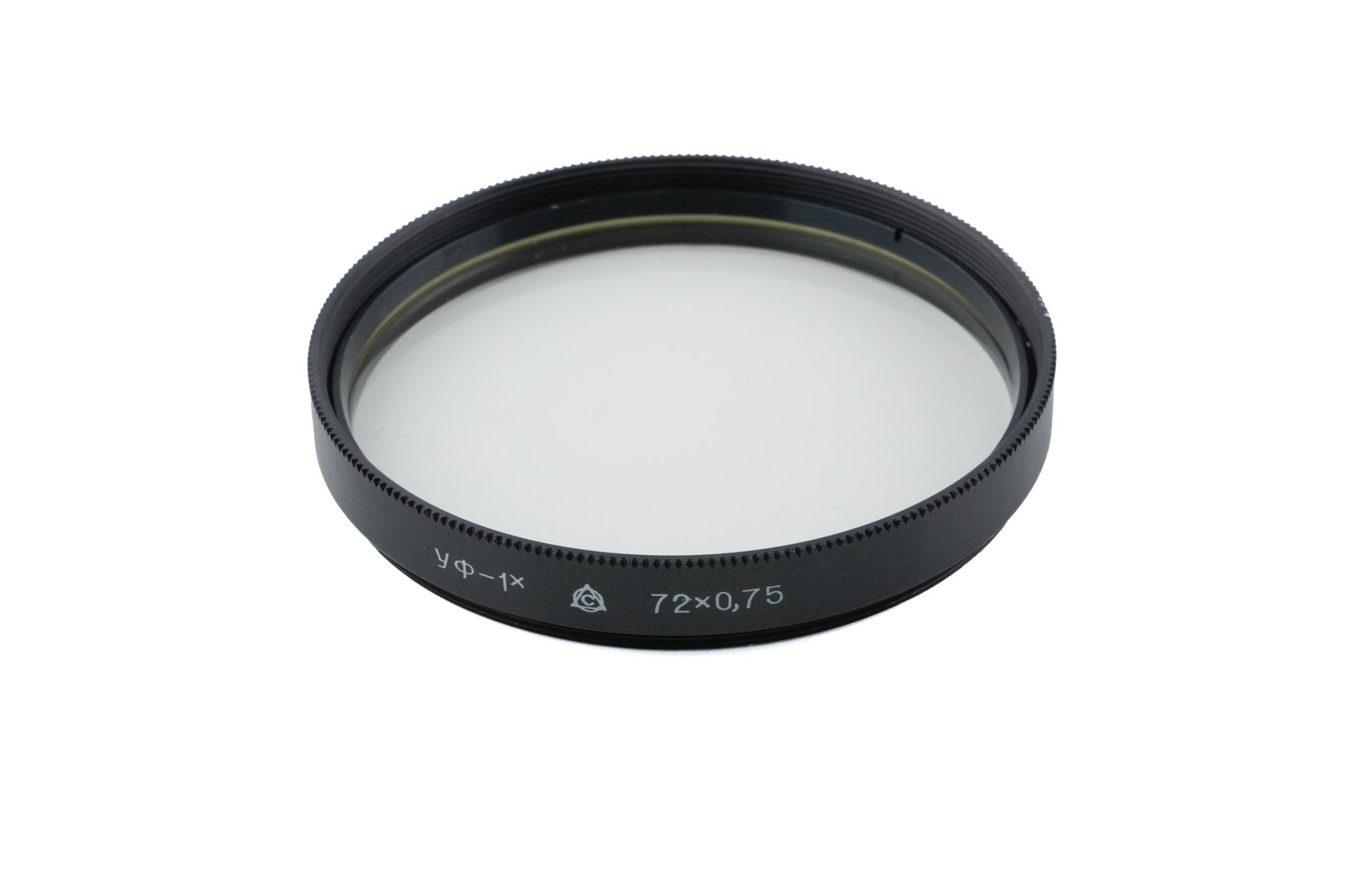 UV filter made for all lenses with 72mm filter threads by LZOS in the Soviet Union. Metal body available in black.
