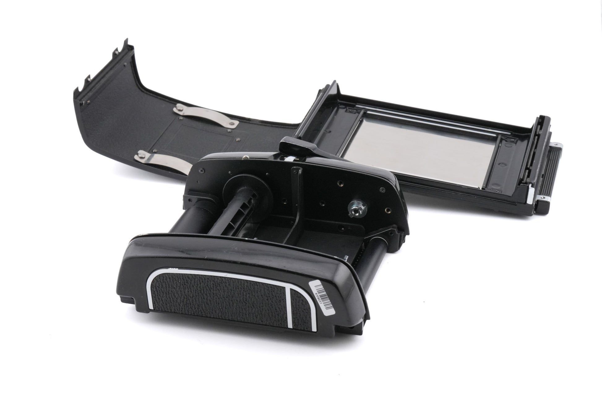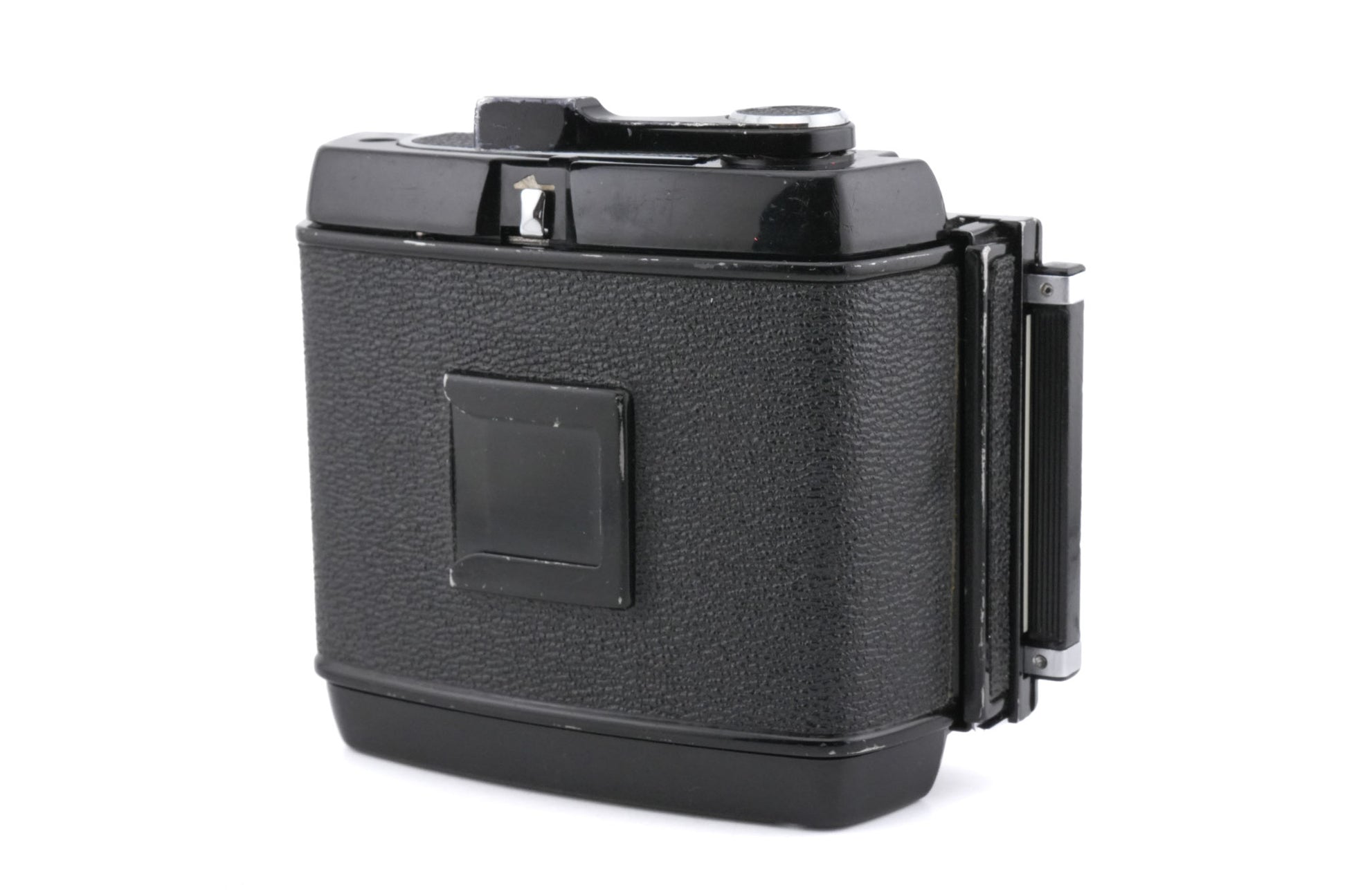 6x7 120-roll film magazine made for the RB67 camera, introduced by Mamiya, released in 1970. Fits 10 6x7 negatives on one roll of 120 film. Plastic and metal body available in black.