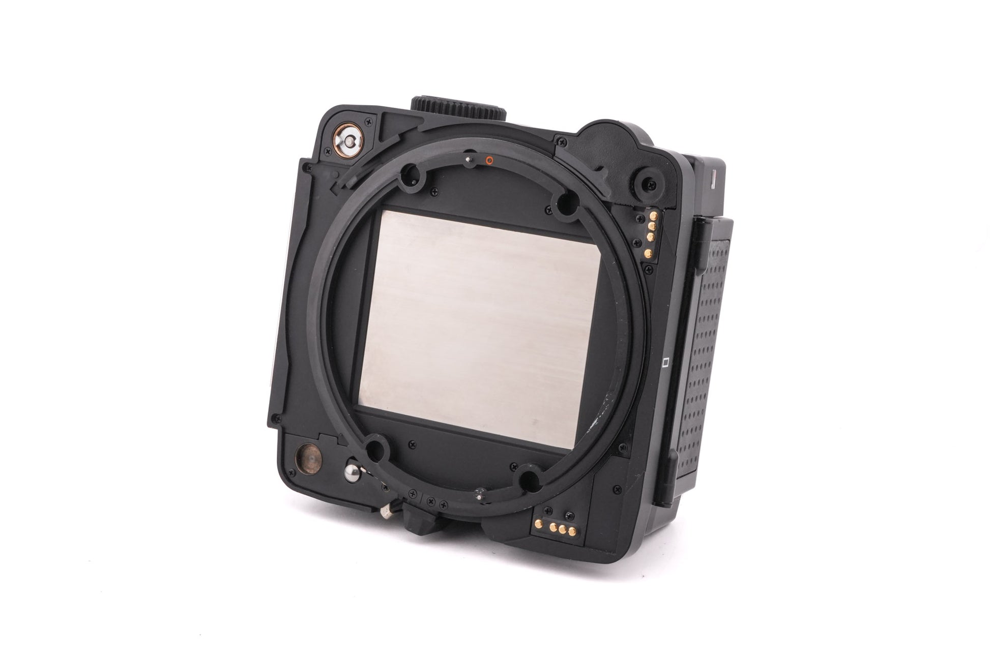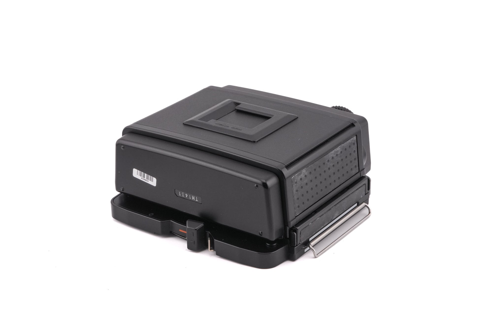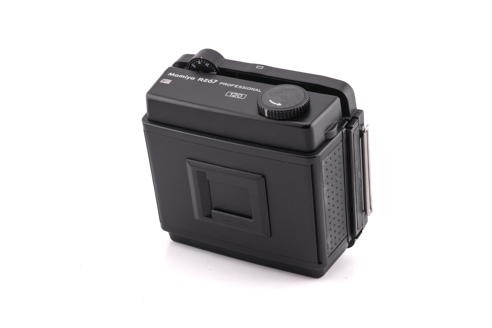 Film back made for RZ67 120 SLRs by Mamiya. This is the second version that added a film memo and dark slide holder. It connects to the body electronically to communicate ISO information. Plastic & metal body available in black.