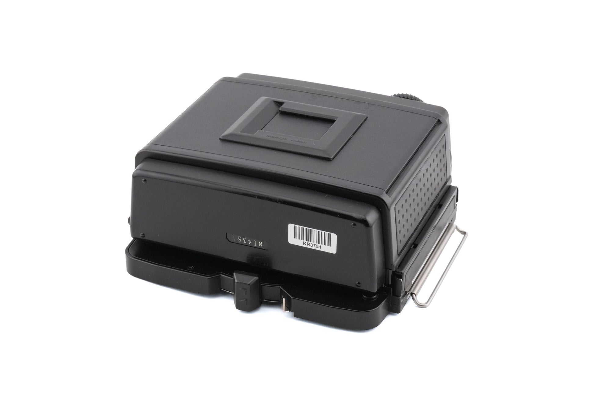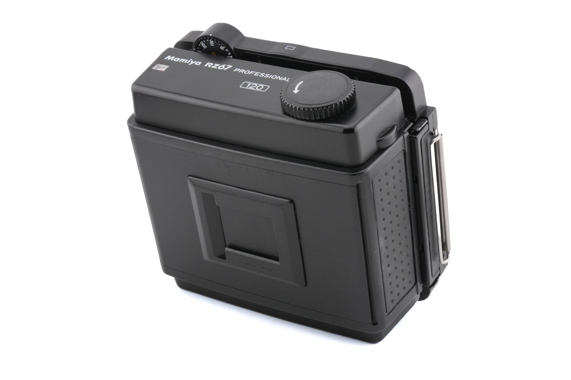 Film back made for RZ67 120 SLRs by Mamiya. This is the second version that added a film memo and dark slide holder. It connects to the body electronically to communicate ISO information. Plastic & metal body available in black.