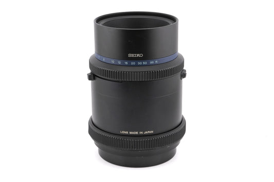 Manual focus telephoto lens made for the Mamiya RZ67 system, introduced by Mamiya. Simple Tessar-type optical design. Built-in Seiko #1 shutter. Metal body available in black finish.