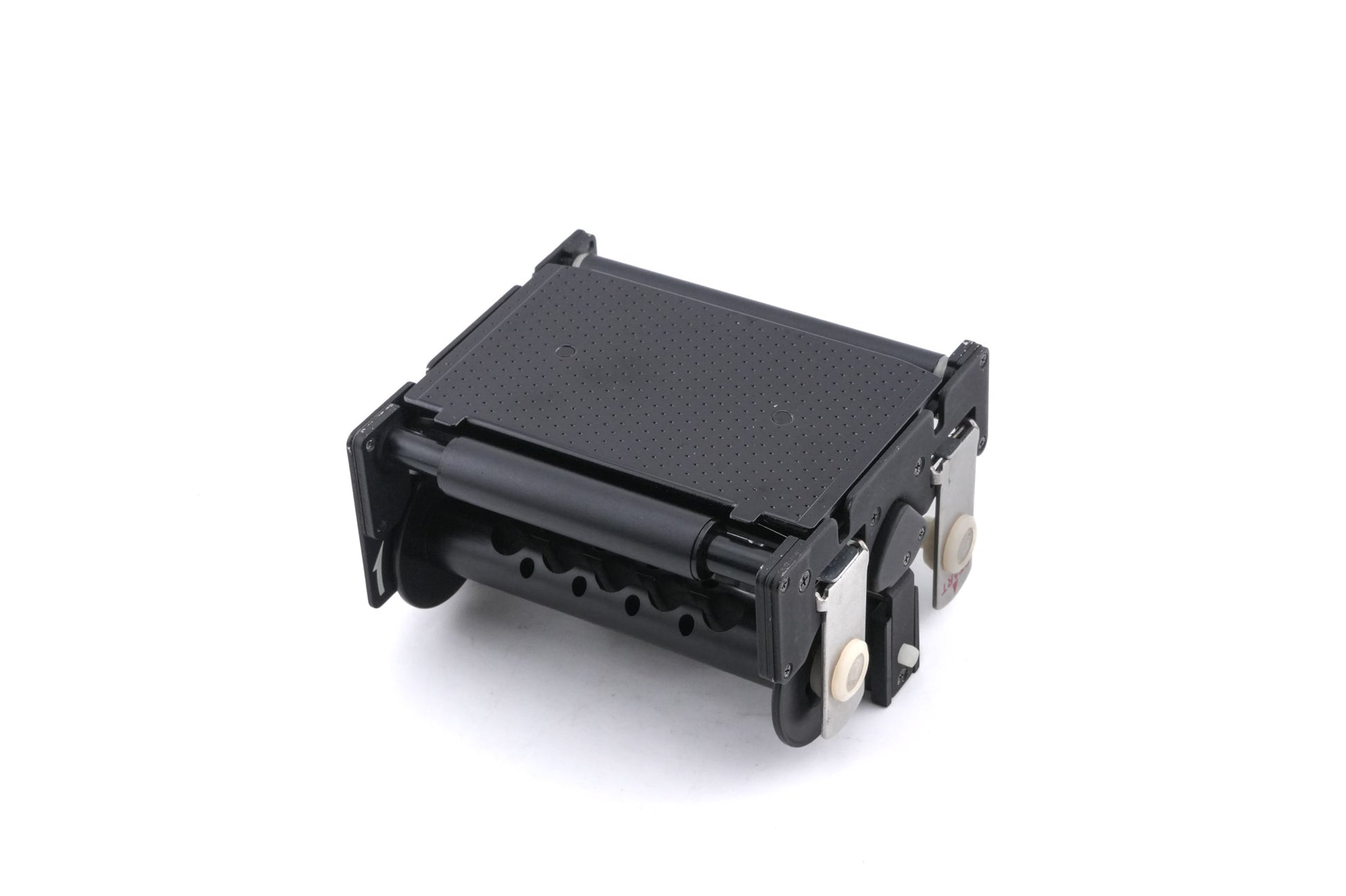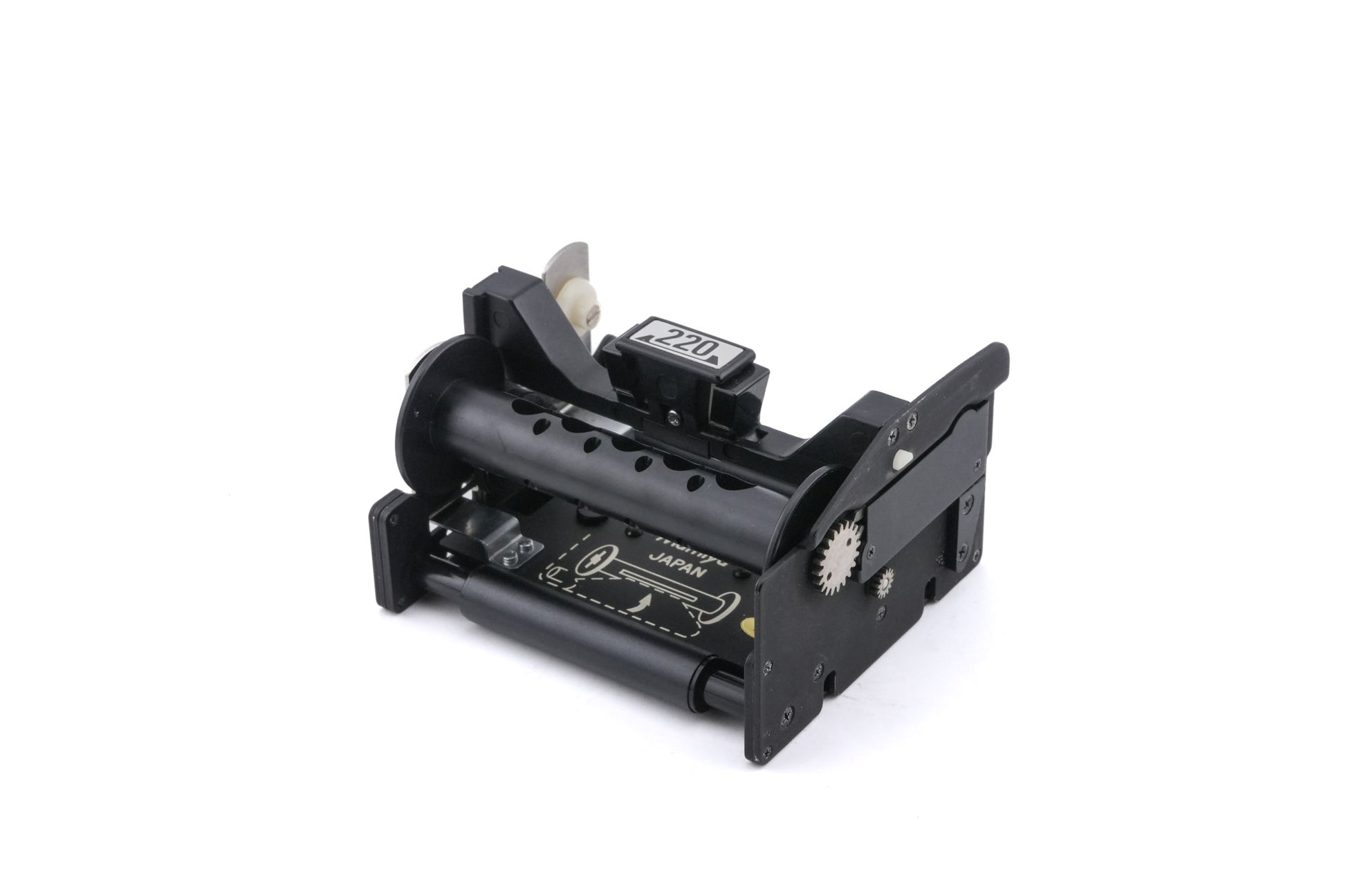 220 roll film insert made for Mamiya M645 models without removable backs by Mamiya. Metal and plastic body available in black