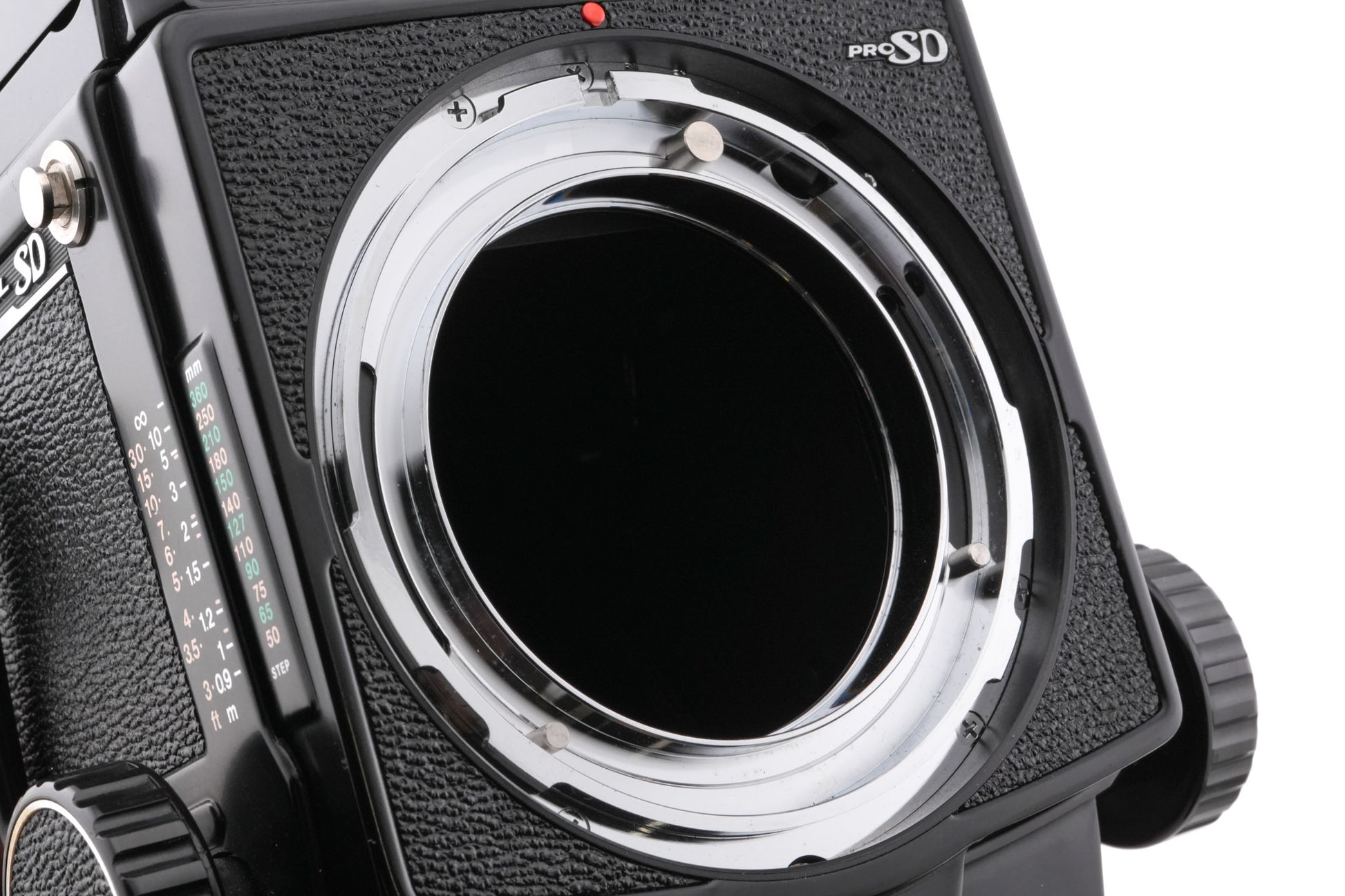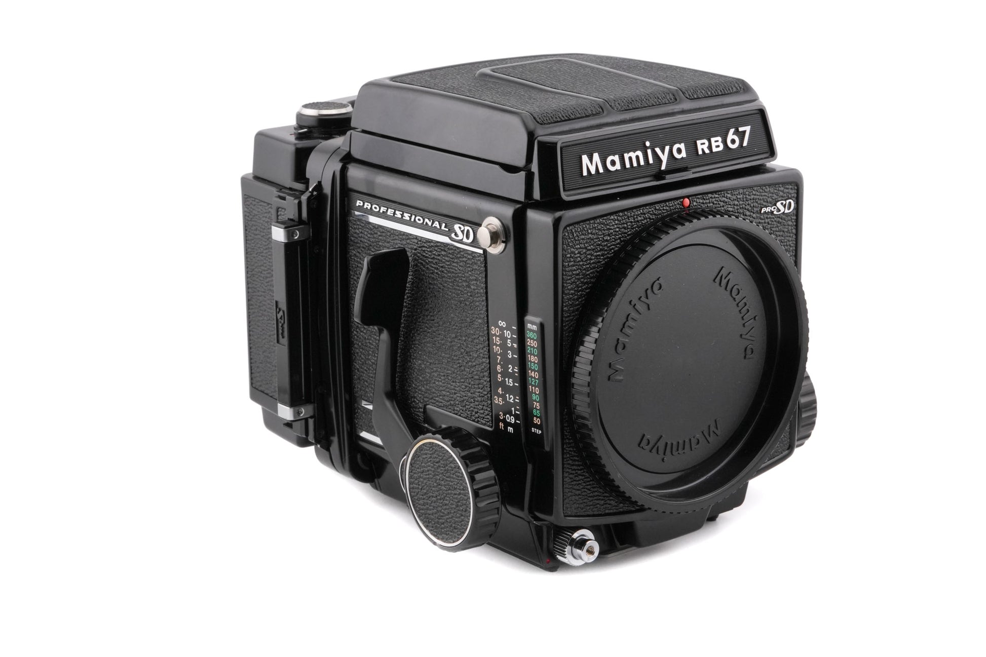 Manual focus RB67 mount 120 SLR camera released by Mamiya in 1990. The Pro-SD was the final version of the Mamiya RB67 line of modular SLRs. It is a fully mechanical system with interchangeable film backs, prisms, focusing screens, grips, and leaf-shutter lenses. The film back can rotate (RB = Rotating Back) to allow for landscape or portrait photography. Plastic/metal body available in black.