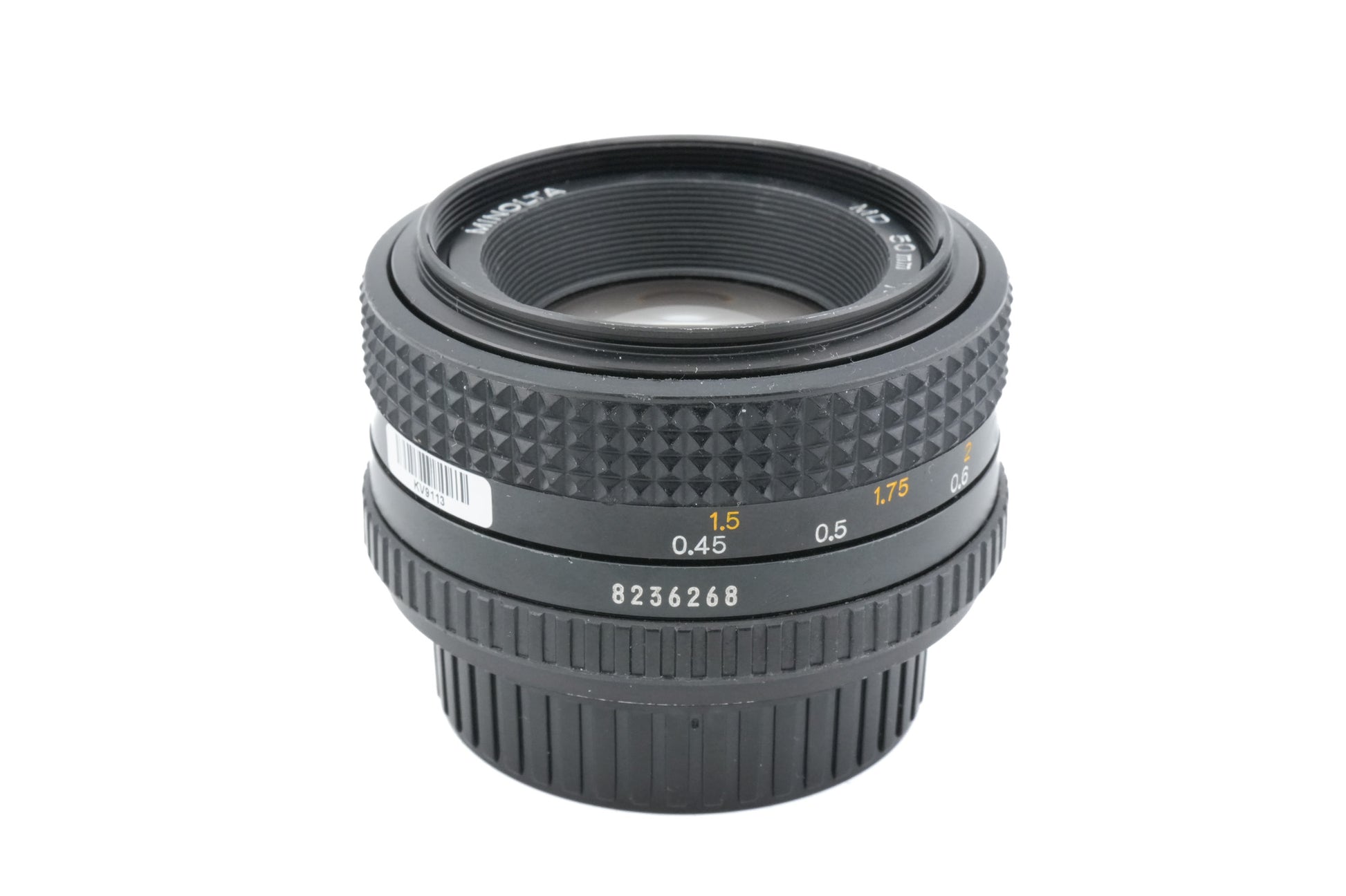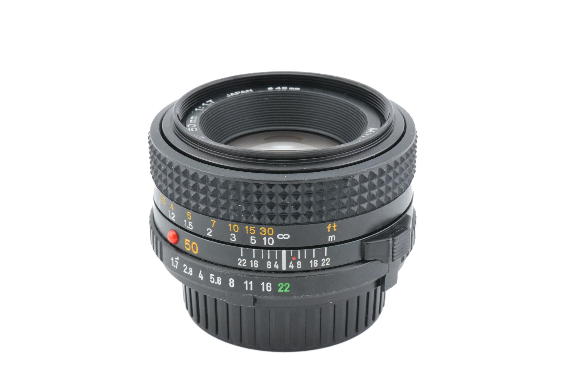 Manual focus normal lens made for MD/SR mount 35mm SLRs made by Minolta. This lens is from the later MD range, supporting advanced metering modes and fully-programmed exposure. Metal body available in black.