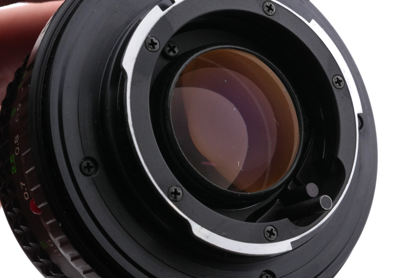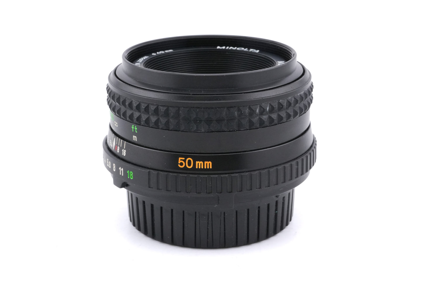 Manual focus normal lens made for MD-mount 35mm SLR cameras by Minolta. Metal body available in black.