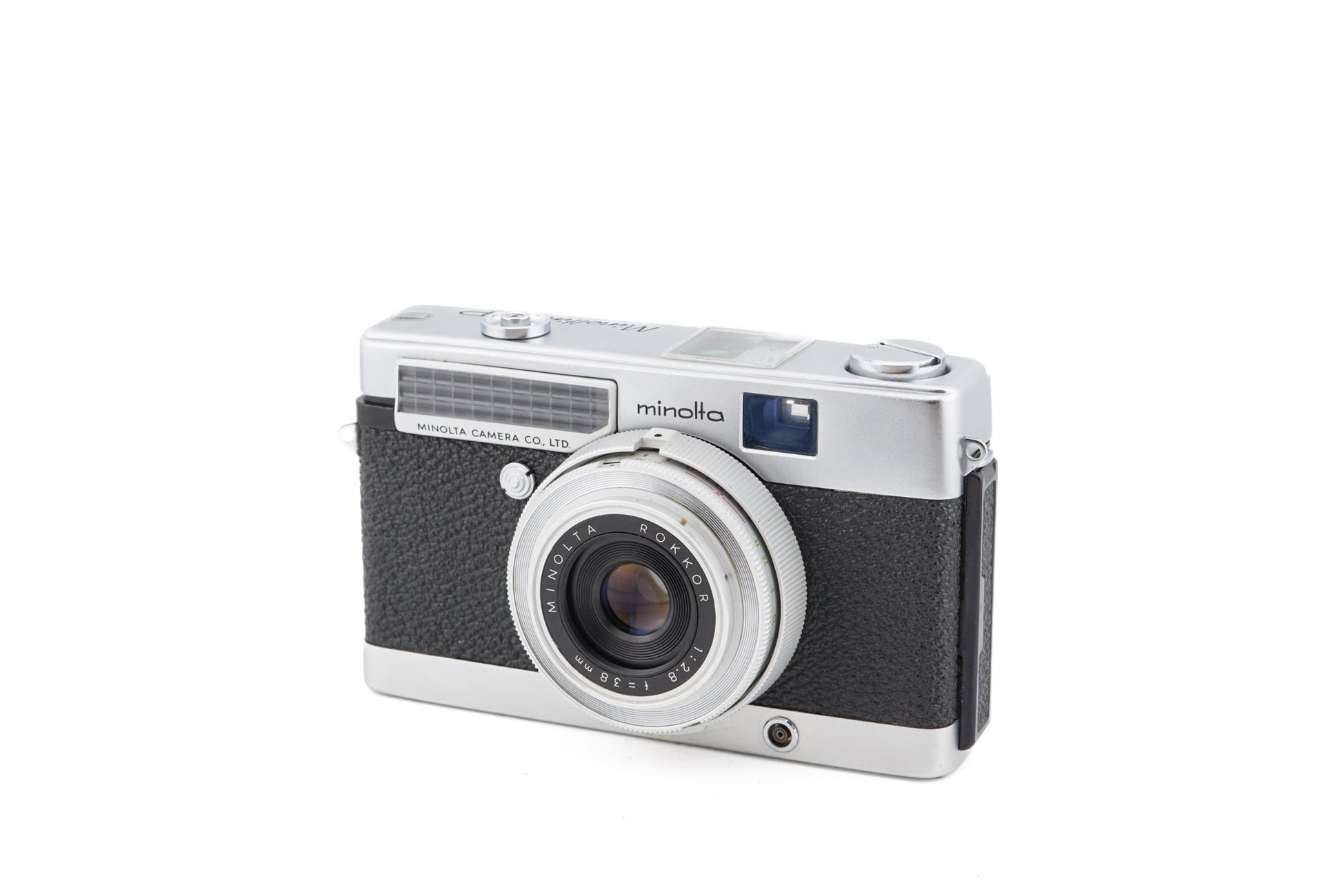 Manual focus 35mm viewfinder camera released by Minolta in 1963. It uses a selenium cell light meter to dictate programmed auto-exposure. Metal body available in silver and black.