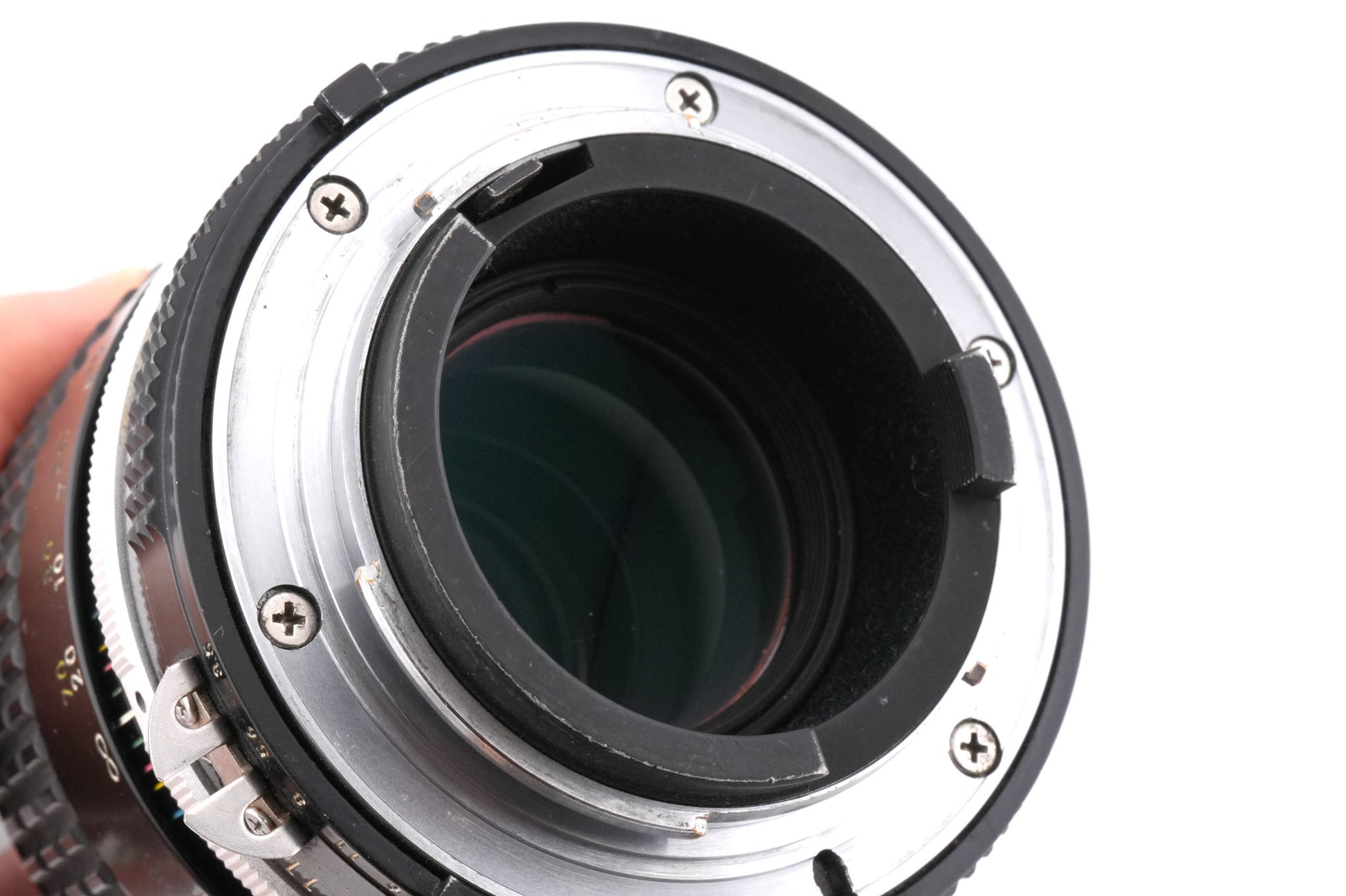 Manual focus telephoto lens made for F-mount SLRs by Nikon starting in 1977. It has both bunny ear prongs and an AI ridge. It will meter normally on all manual Nikon cameras. Metal body available in black.