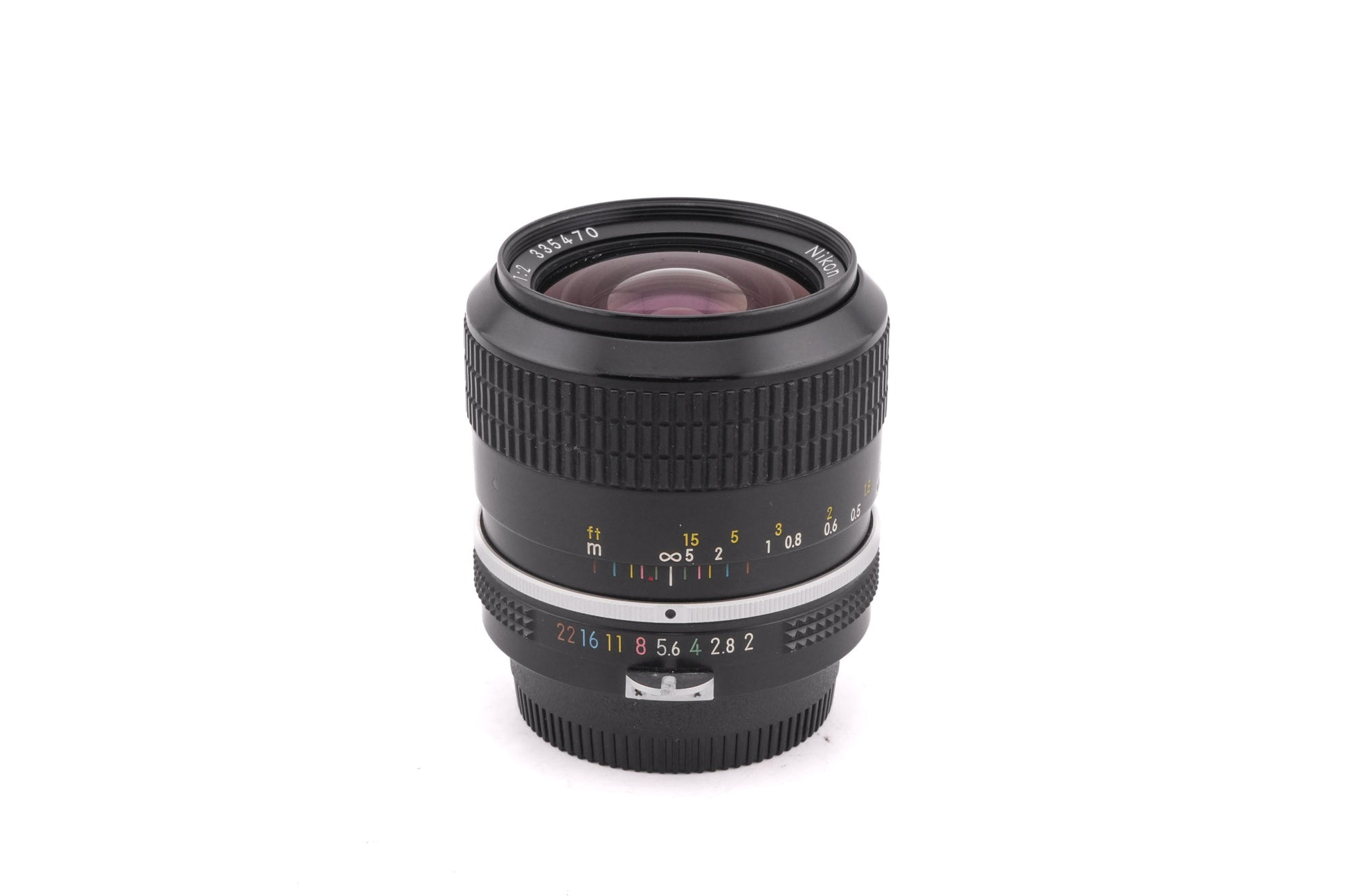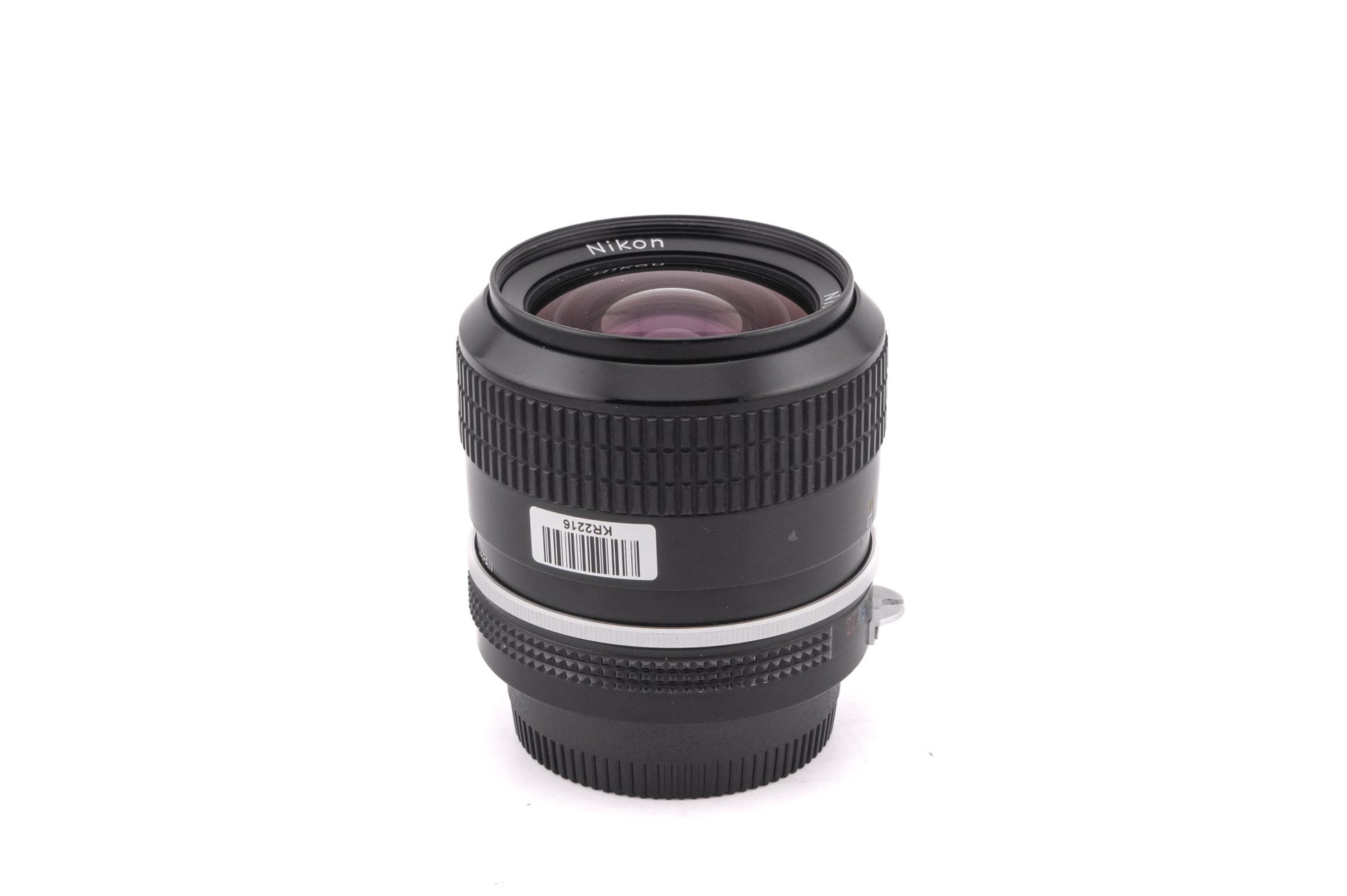 Manual focus wide-angle lens made for F-mount 35mm SLR cameras introduced by Nikon starting in 1974. These K-type lenses are from the transition from Pre-AI to AI lens designs. They are still Pre-AI but have the newer external design as the later AI lenses. The letter K does not appear anywhere on either lens. Metal and plastic body available in black.