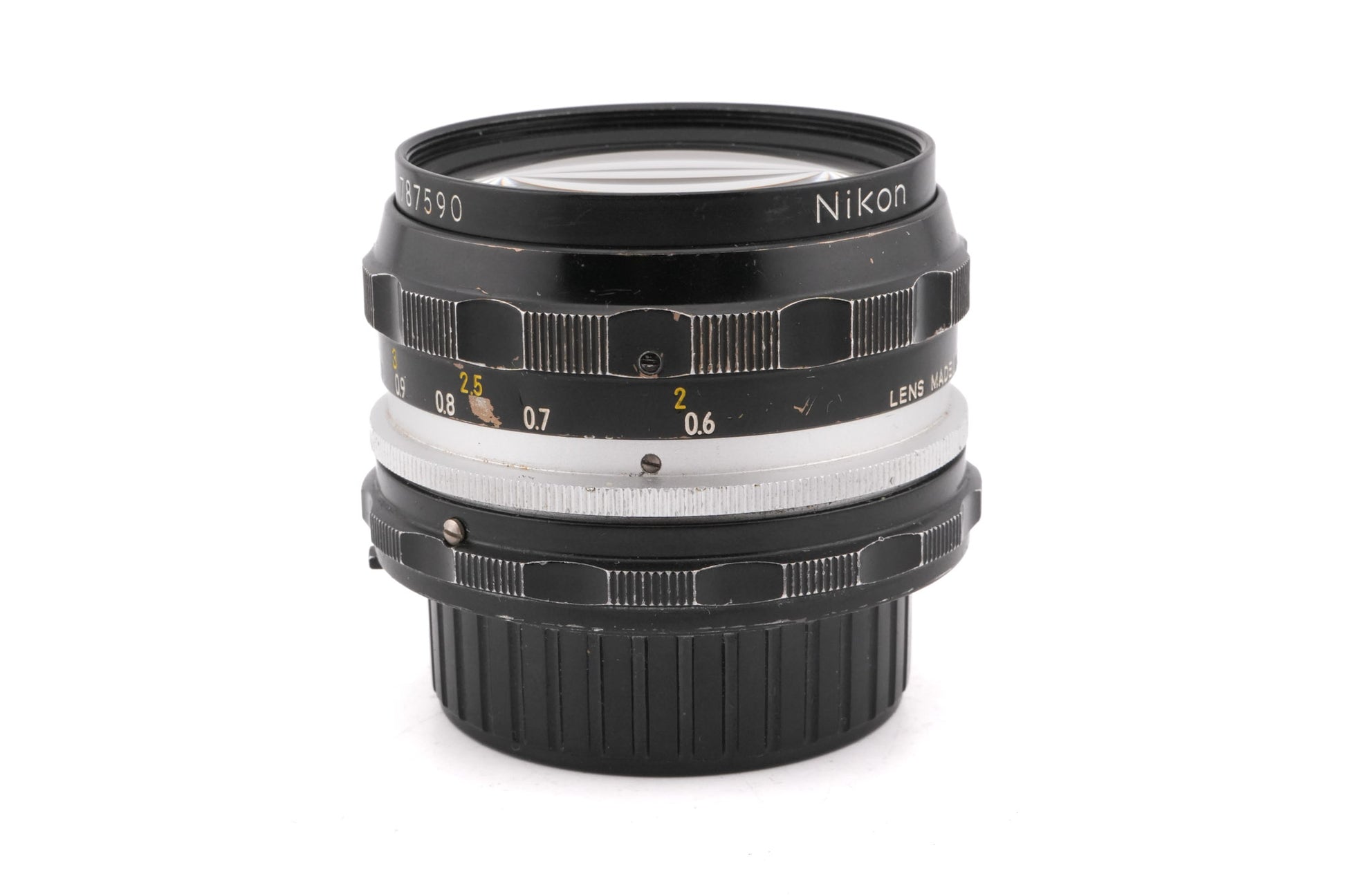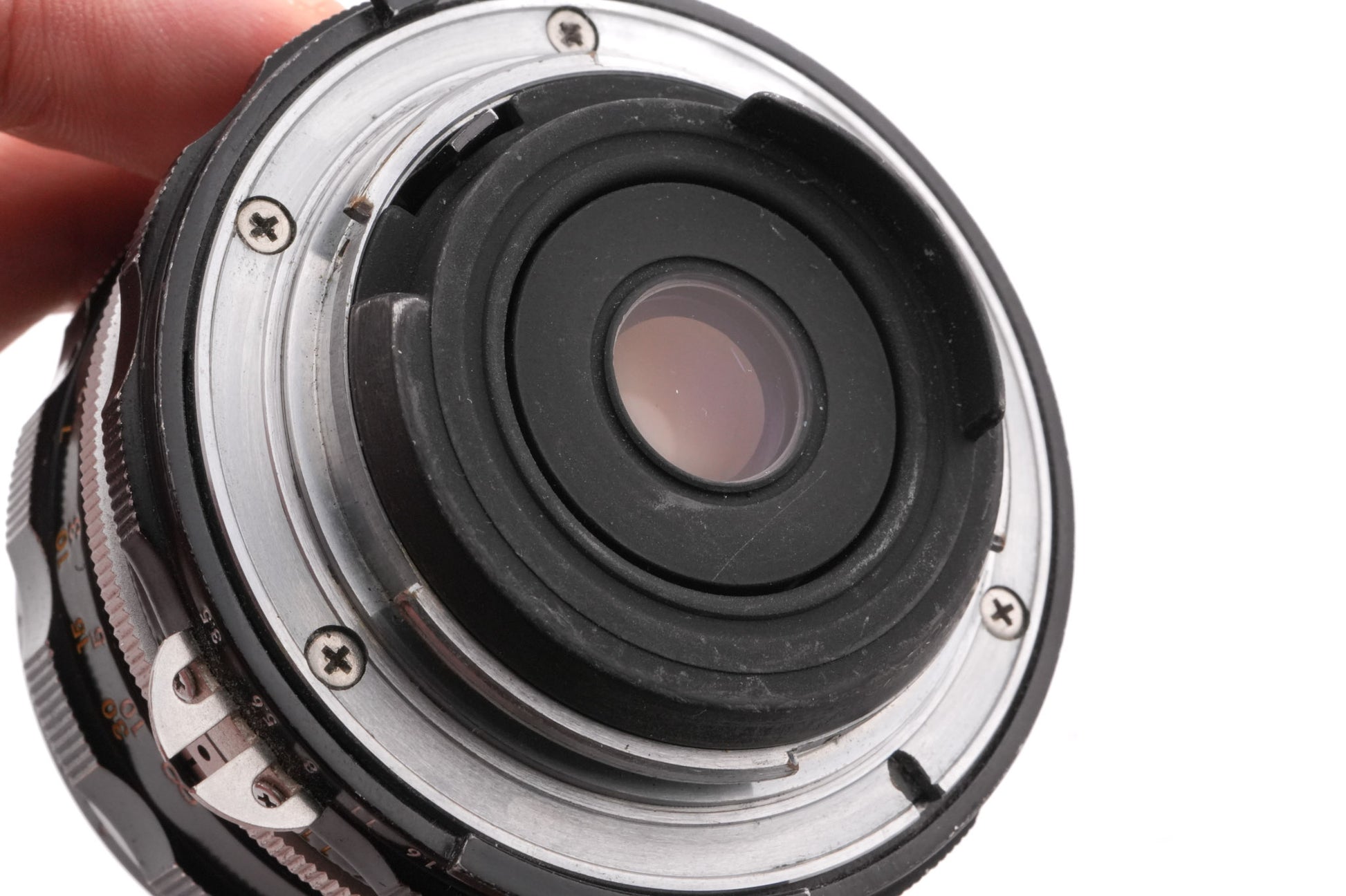 Manual focus wide angle lens made for F-mount 35mm SLR cameras introduced by Nikon in 1960. This is a Pre-Ai model that has been modified by Nikon or a previous owner to have the AI ridge as well. It will meter properly with all manual focus Nikon SLRs. Metal body available in black.