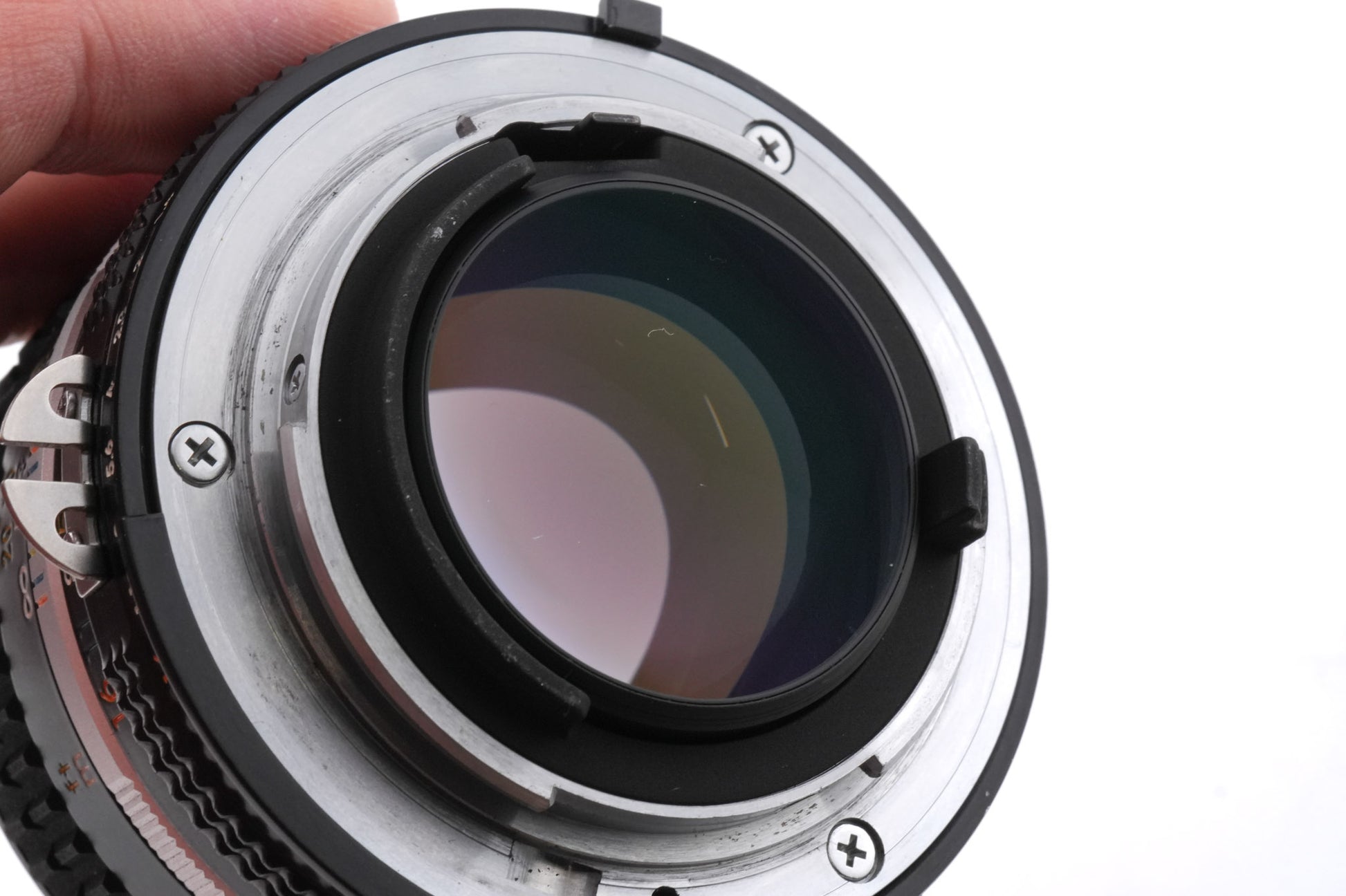 Manual focus normal lens made for F-mount 35mm SLR cameras by Nikon. It has the bunny ear metering prongs, AI ridge, and AI-S indent so it will meter properly on all manual Nikon cameras and will work with the advanced program modes of later models. Metal body available in black.