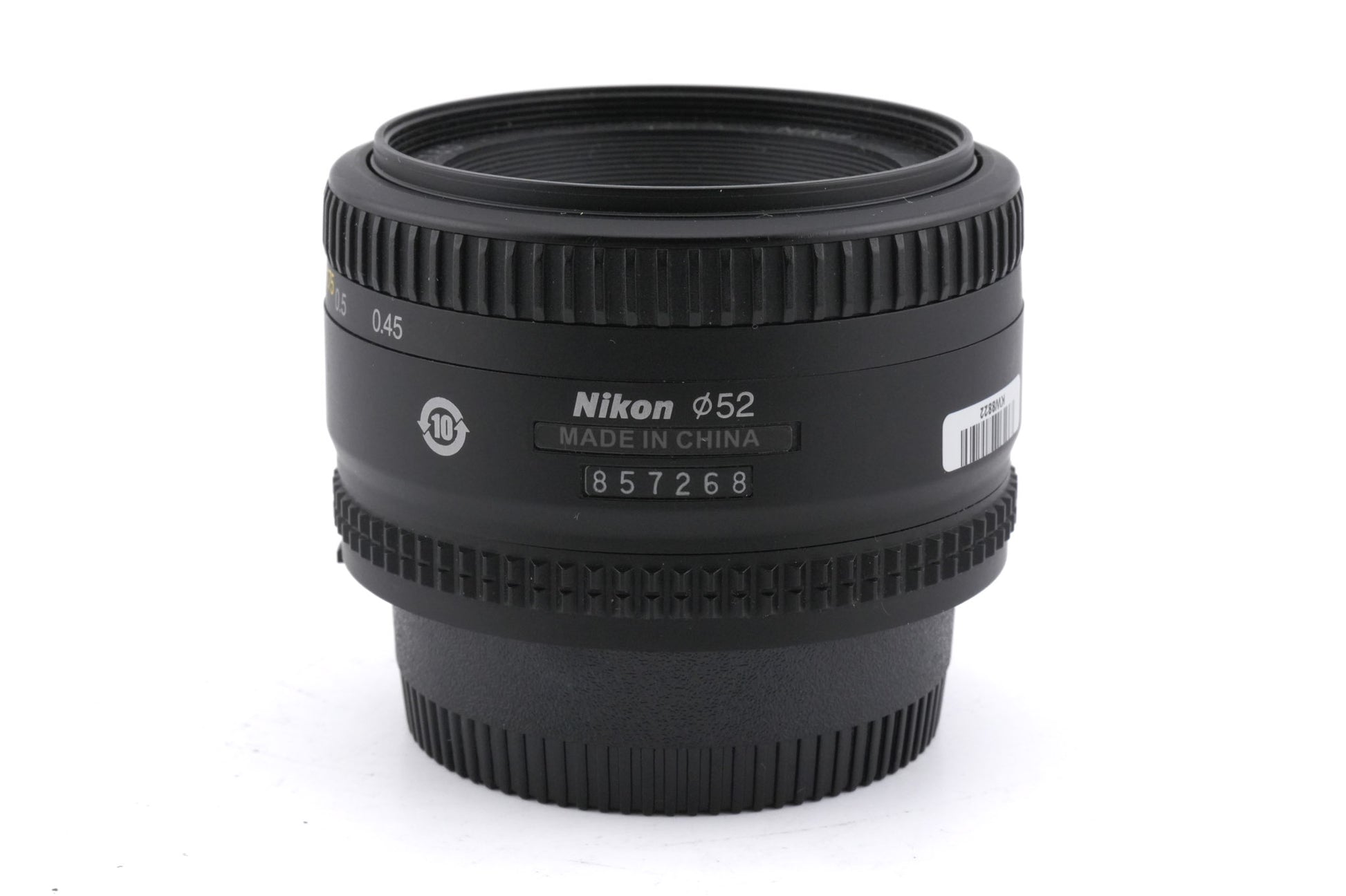 Autofocus normal lens made for F-mount SLR cameras by Nikon. It does not have a built-in focus motor, so autofocus does not work on the cheaper Nikon cameras. Plastic and metal body available in black.