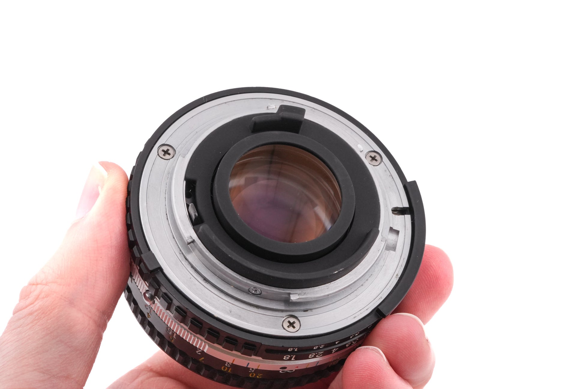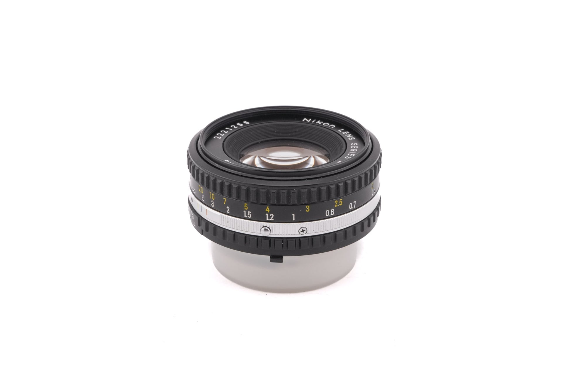 Manual focus normal lens made for F-mount 35mm SLRs by Nikon. It does not have the bunny ear metering prongs but does have the AI ridge and AI-S indent, so it will meter properly on nearly all manual focus Nikon cameras (excluding F, F2, and Nikkormat) and will work with the advanced program modes of later models. Early versions are all black, and later versions have a chrome ring. Metal and plastic body available in black.