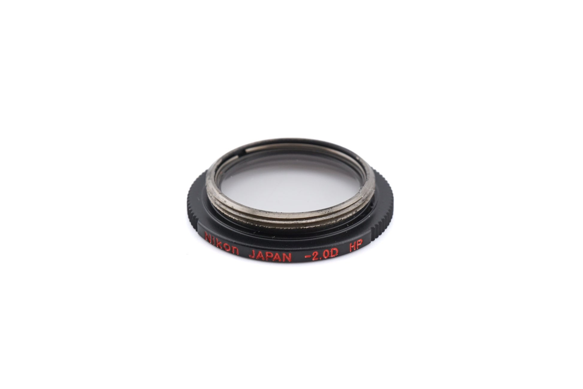 -2.0 eyepiece correction lens made by Nikon for Nikon FM3A, FA, FE2, FM2, FE & FM cameras. It can also be used on other cameras with 19mm diopters. Metal body available in black.
