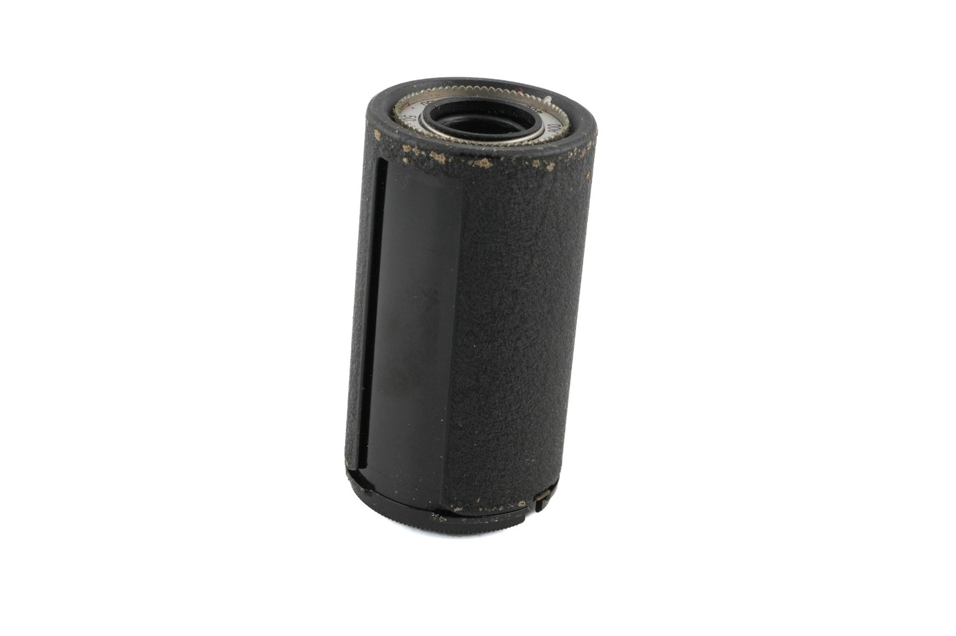 Reloadable film cassette made for Nikon F cameras by Nikon. The cassette consists of outer and inner shells and a spool. Has an ASA reminder on the bottom. Metal body available in black.