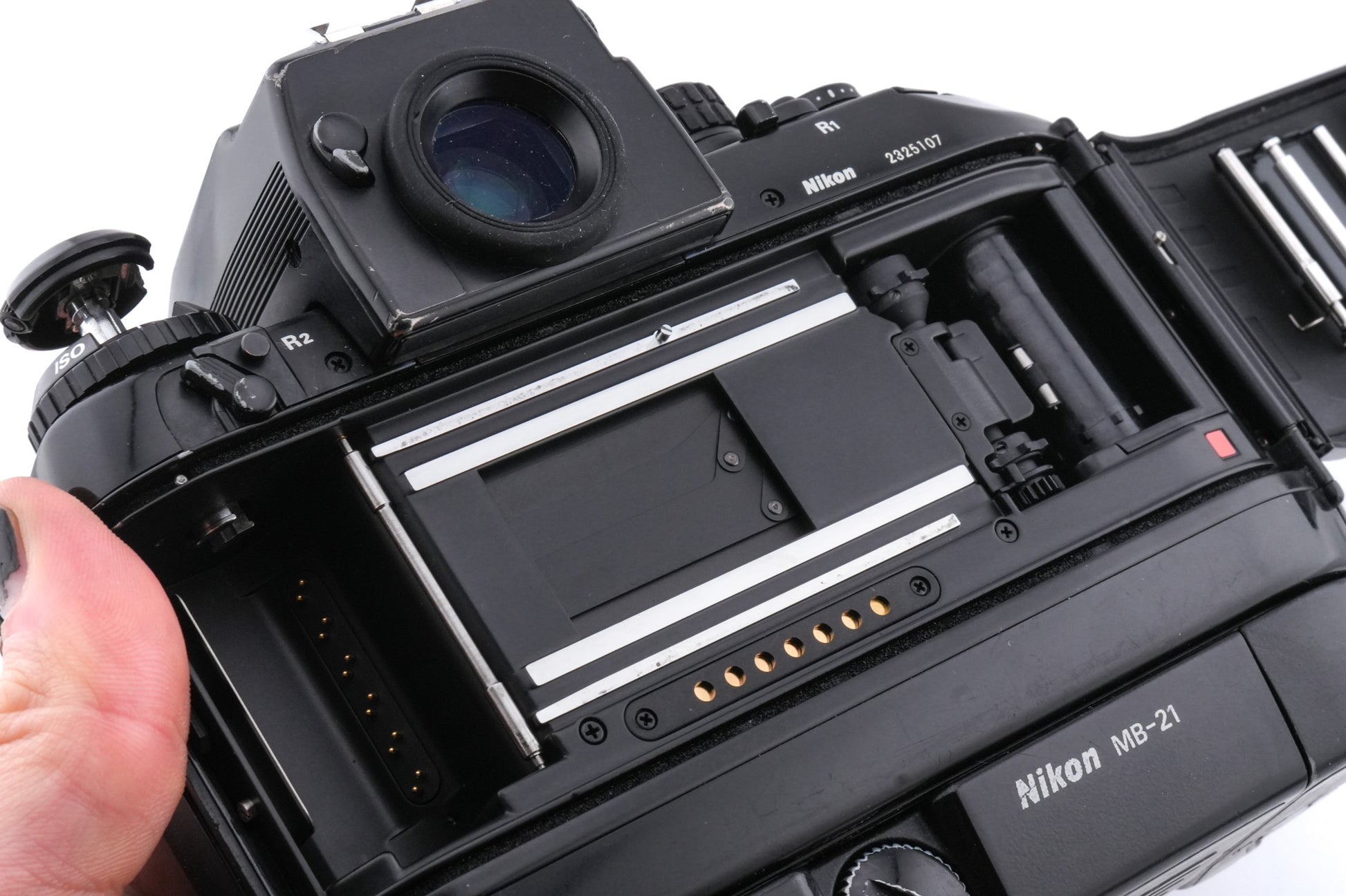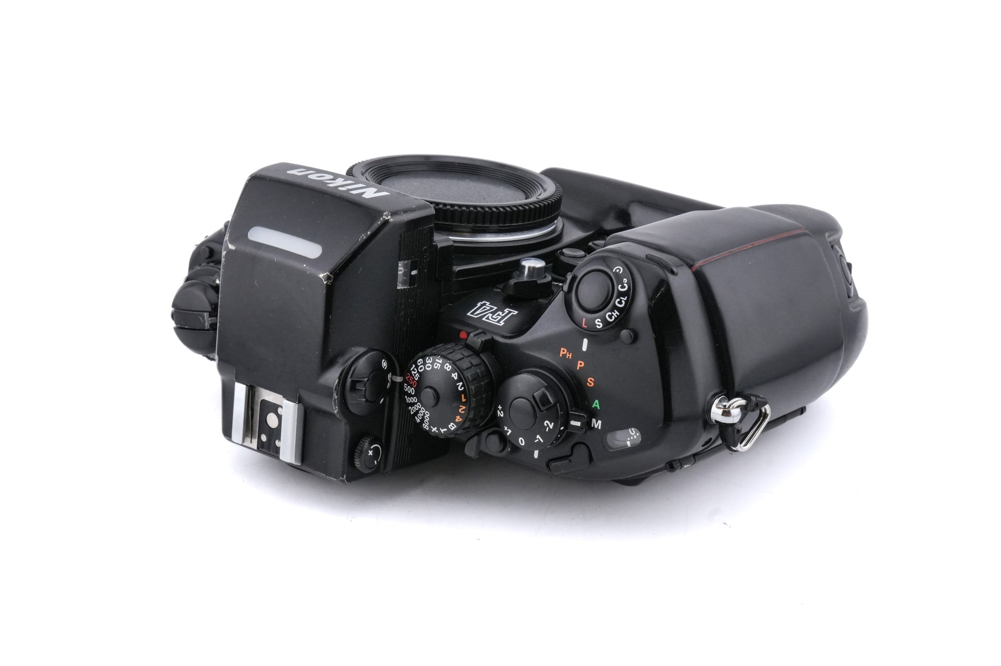 Autofocus F-mount 35mm SLR released by Nikon in 1988. This is the base F4 with the MB-20 battery grip. The body has matrix metering, weather sealing, interchangeable grips, finders, and focusing screens. It will work natively with AI and AI-S lenses (including matrix metering!) as well as autofocus lenses with aperture rings. Later autofocus lenses without aperture rings can only be used in program and shutter priority modes and without image stabilization (VR). Metal and plastic body available in black with a red accent.