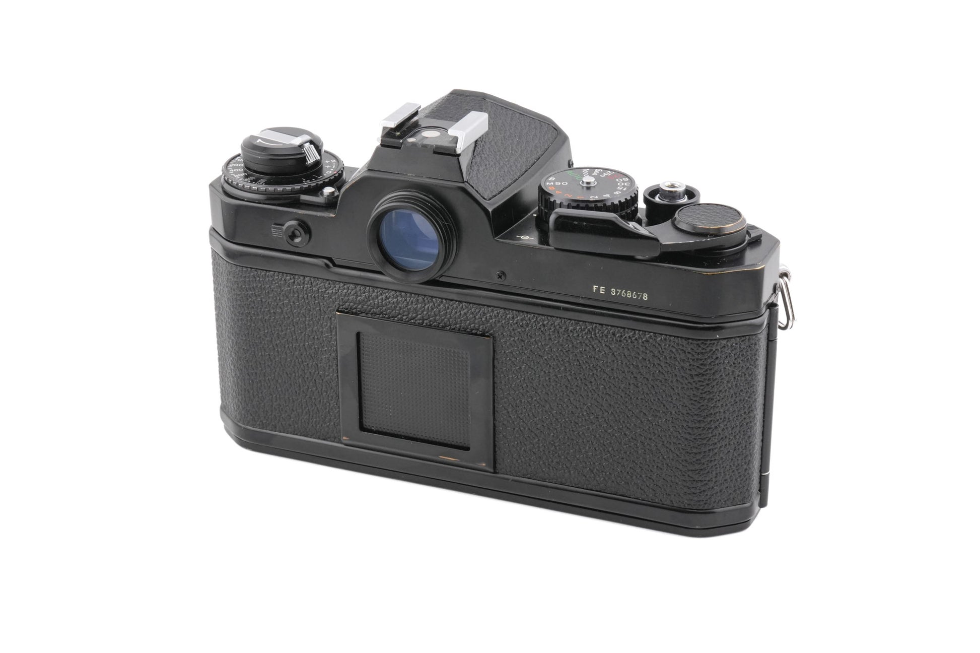 Manual focus F-mount 35mm SLR released by Nikon in 1978. It was a replacement for the Nikon EL2 and EL-W. The FE has an electronically-controlled focal plane shutter and is capable of aperture priority auto exposure as well as manual exposure. It will only meter properly with lenses that have the AI ridge and an aperture ring. Metal body available in black & silver.