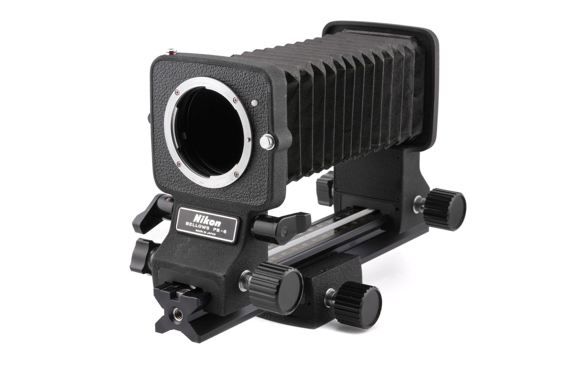 Macro bellows made for F-mount SLRs by Nikon. Bellows extension range is from 48 to 208mm. Metal body available in black.