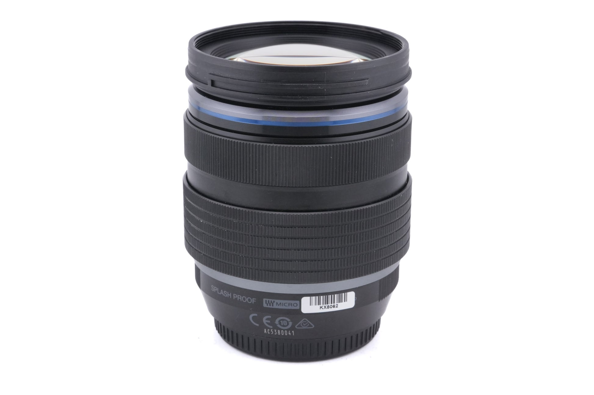 Autofocus zoom lens made for Micro Four Thirds mount mirrorless digital cameras by Olympus. The lens is designed for Micro Four Thirds-sized sensors and gives the equivalent field of view to a 24-80mm lens on full frame/35mm. It has IEC Standard publication 60529 IPX1 splash protection (when paired with a splashproof body) as well as dust protection. Metal body available in black.