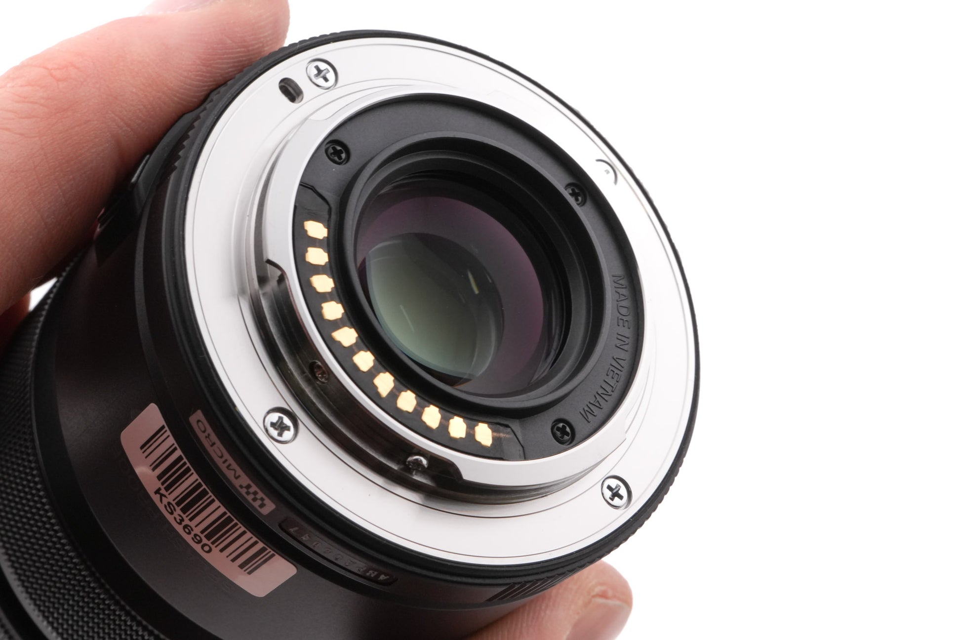 Autofocus zoom lens made for Micro Four Thirds mount mirrorless cameras by Olympus. It has a clutch for manual zoom, electronic power zoom, and macro mode. It also has a lens function button. Plastic body available in black or silver.