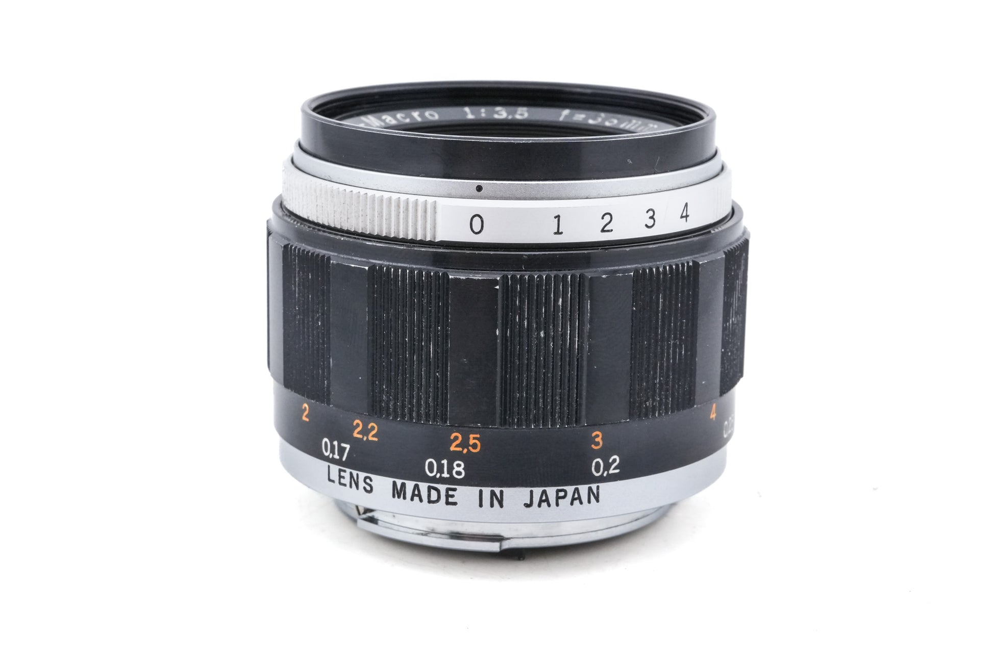 Manual focus normal macro lens made for PEN F mount 35mm half-frame SLRs by Olympus. It gives the equivalent field of view to a 55mm lens on full frame/35mm. Metal body available in black/silver.