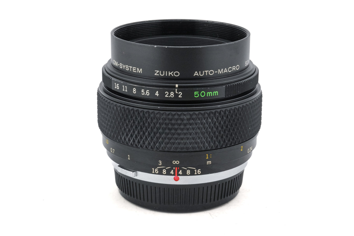 Manual focus normal macro lens made for OM-mount 35mm SLR cameras introduced by Olympus. It has a 1:2 reproduction ratio. Metal body available in black.