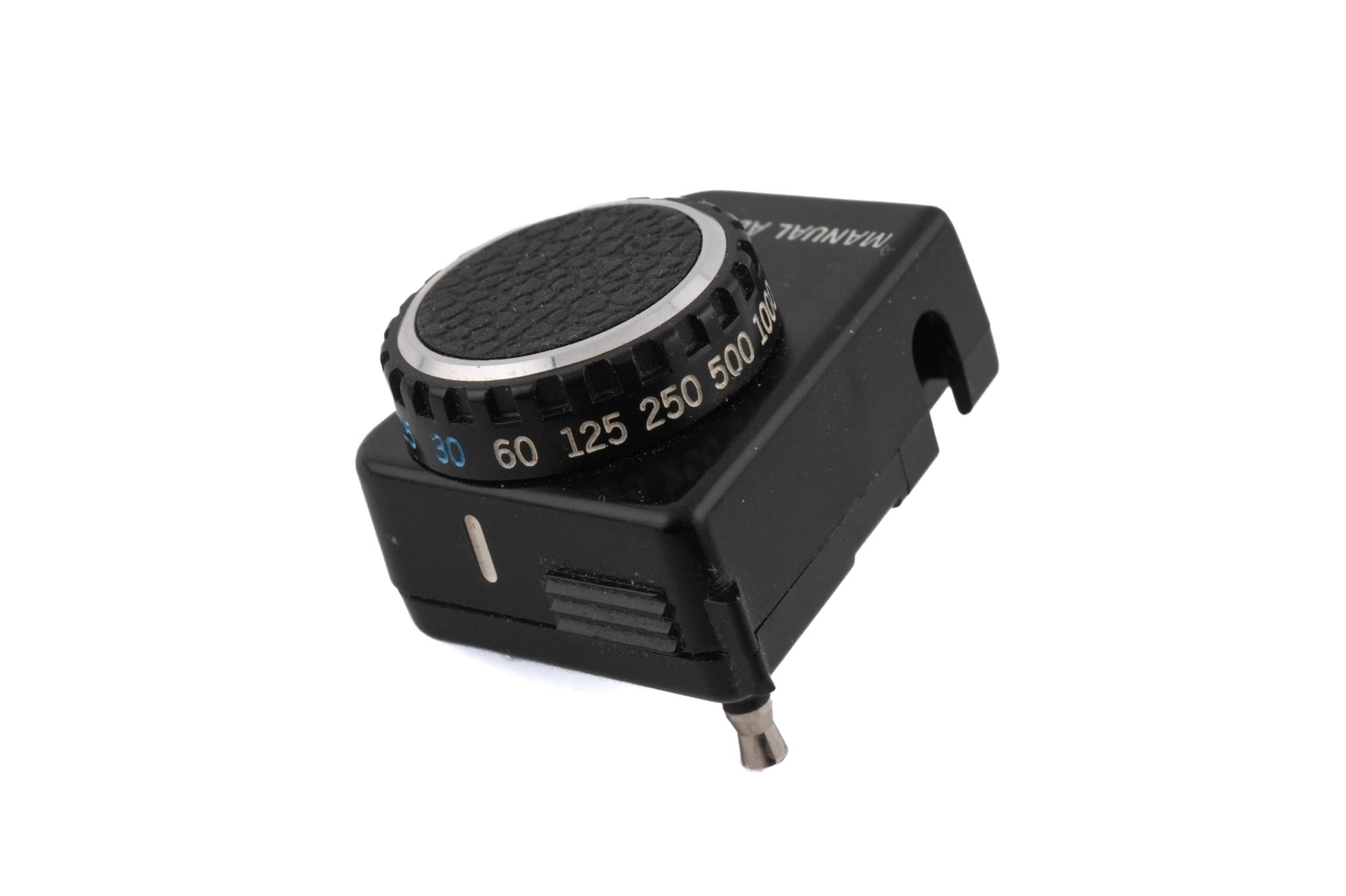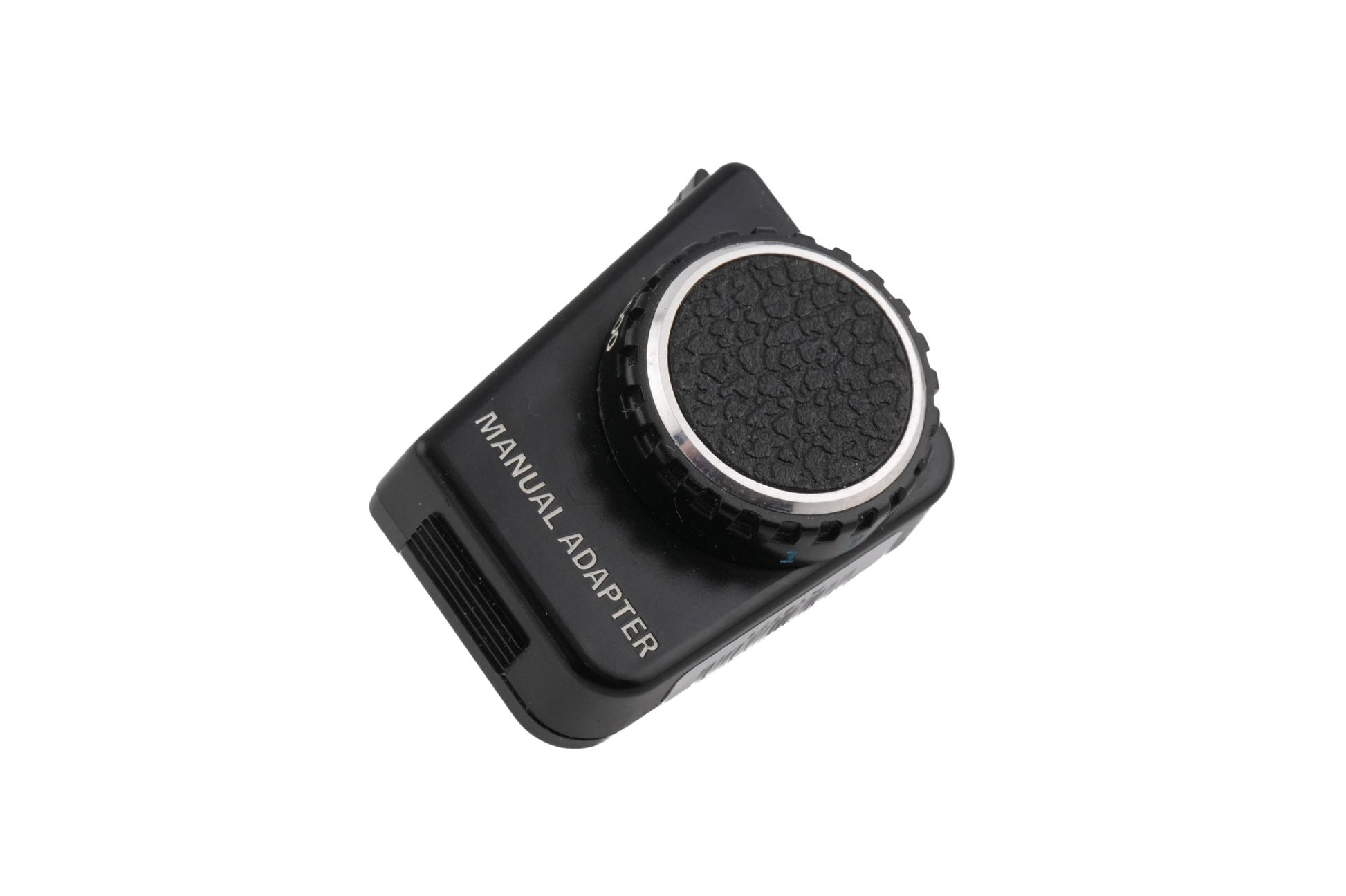 Manual adapter made by Olympus. It is used for manually selecting shutter speeds on the otherwise aperture priority Olympus OM10. The adapter plugs into the front of the camera, underneath the rewind knob. Just set the OM10 to "Manual" mode! Plastic body available in black.