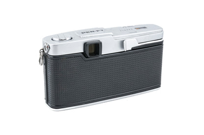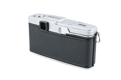 Manual focus PEN F-mount 35mm half-frame SLR camera released by Olympus. It features a built-in light meter with its own numbering system for exposure. It uses a 1.3v mercury battery. Metal body available in silver & black.