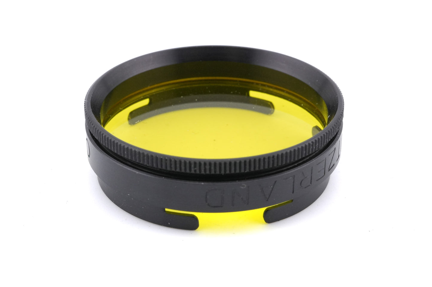 Yellow push-on filter made by Omag for lenses with 30mm filter attachment mounts. Metal body available in black.