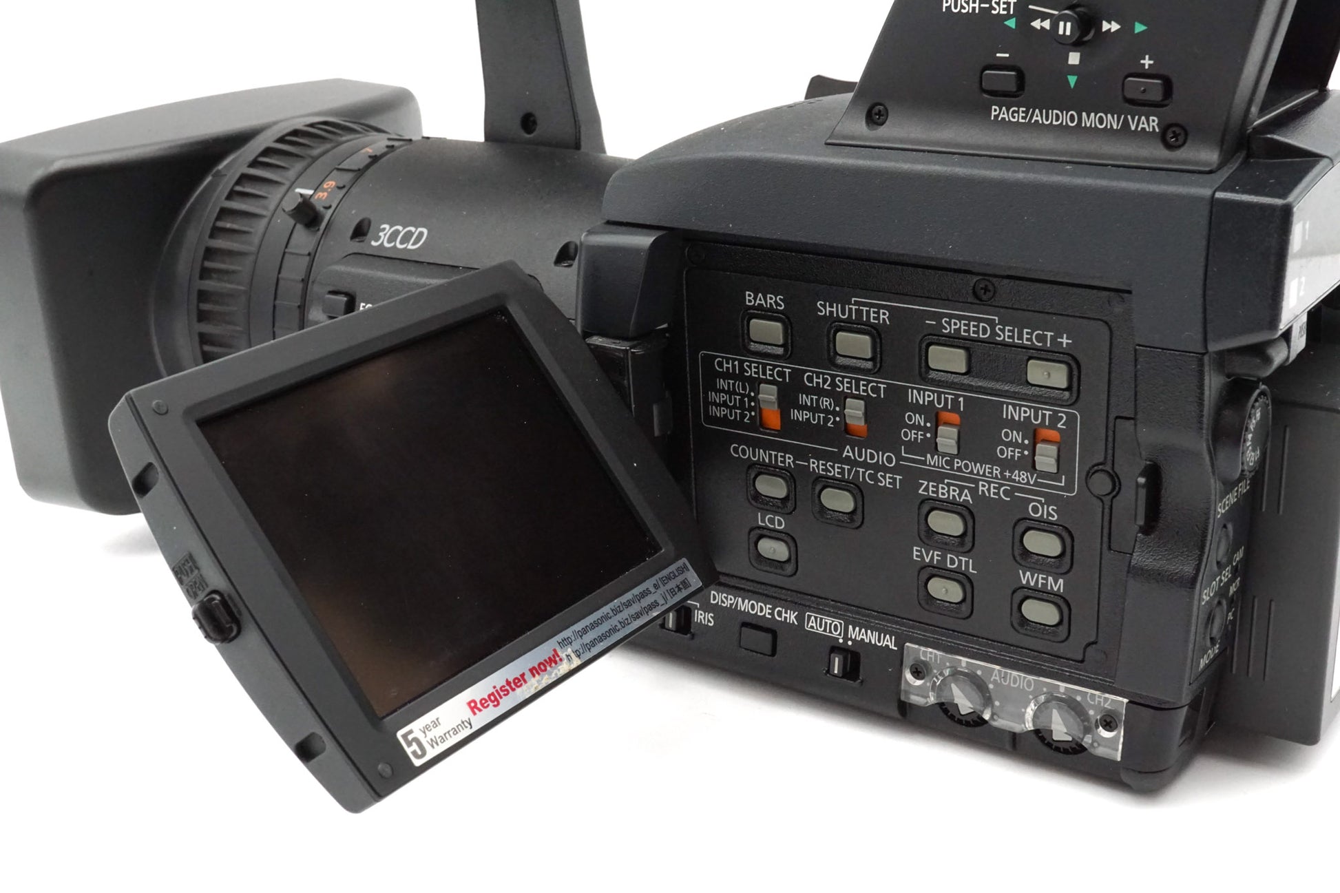 Autofocus digital professional video camera made by Panasonic. It features internal ND-filters, two XLR ports, SDI output, and a 'cinelike' gamma. Plastic body available in black.