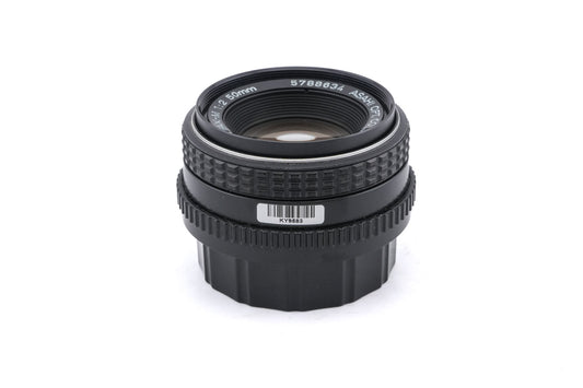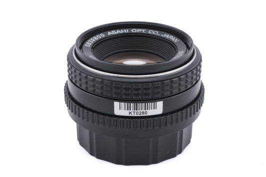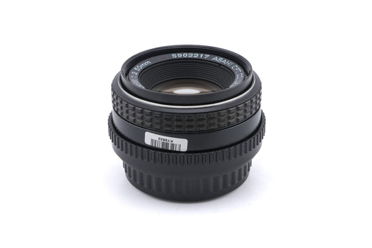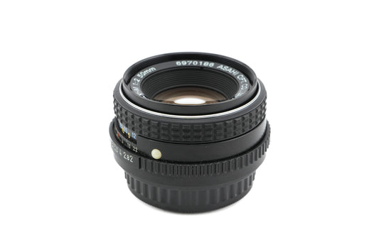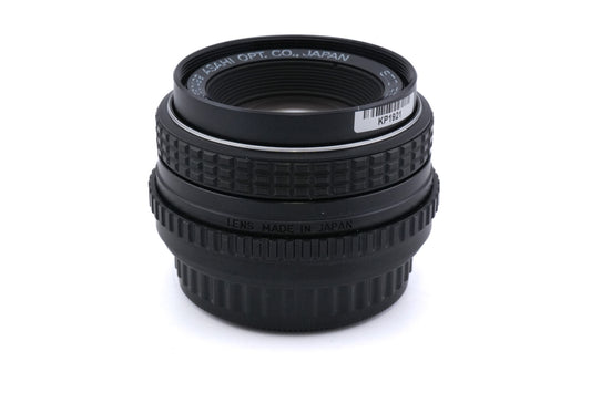 Manual focus normal lens made for K-mount 35mm SLR cameras introduced by Pentax. Early models were all-metal, but after the release of the Pentax-A line, some plastic parts were used. Metal and plastic body available in black.