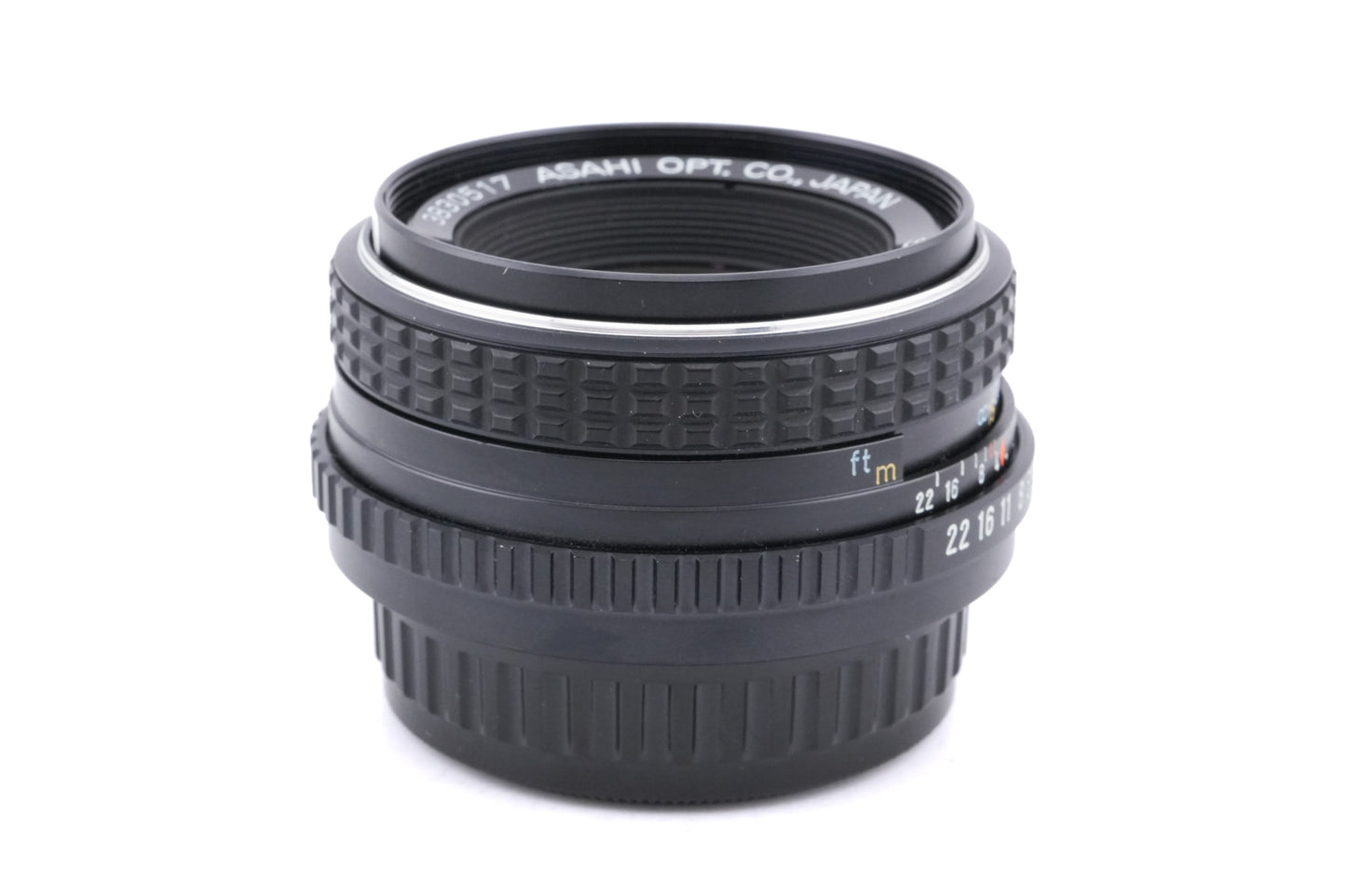 Manual focus normal lens made for K-mount 35mm SLR cameras introduced by Pentax. Early models were all-metal, but after the release of the Pentax-A line, some plastic parts were used. Metal and plastic body available in black.