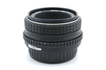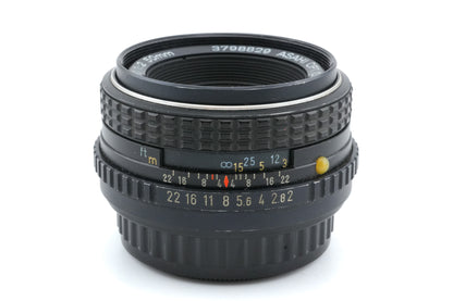 Manual focus normal lens made for K-mount 35mm SLR cameras introduced by Pentax. Early models were all-metal, but after the release of the Pentax-A line, some plastic parts were used. Metal and plastic body available in black.