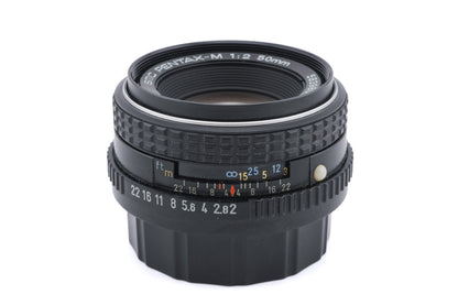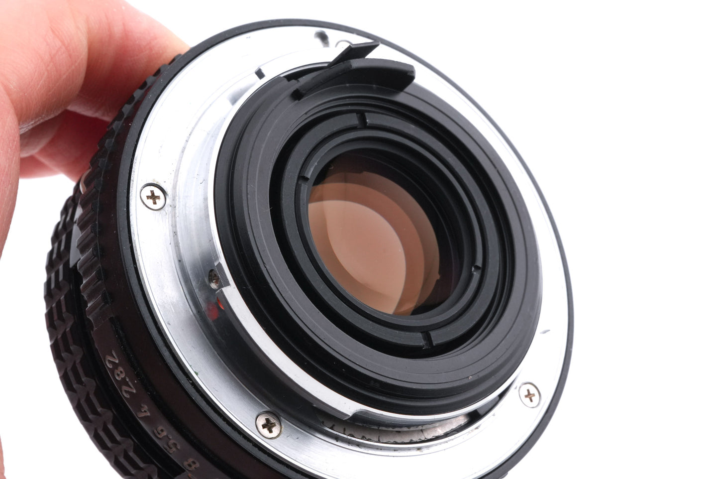Manual focus normal lens made for K-mount 35mm SLR cameras introduced by Pentax. Early models were all-metal, but after the release of the Pentax-A line, some plastic parts were used. Metal and plastic body available in black.