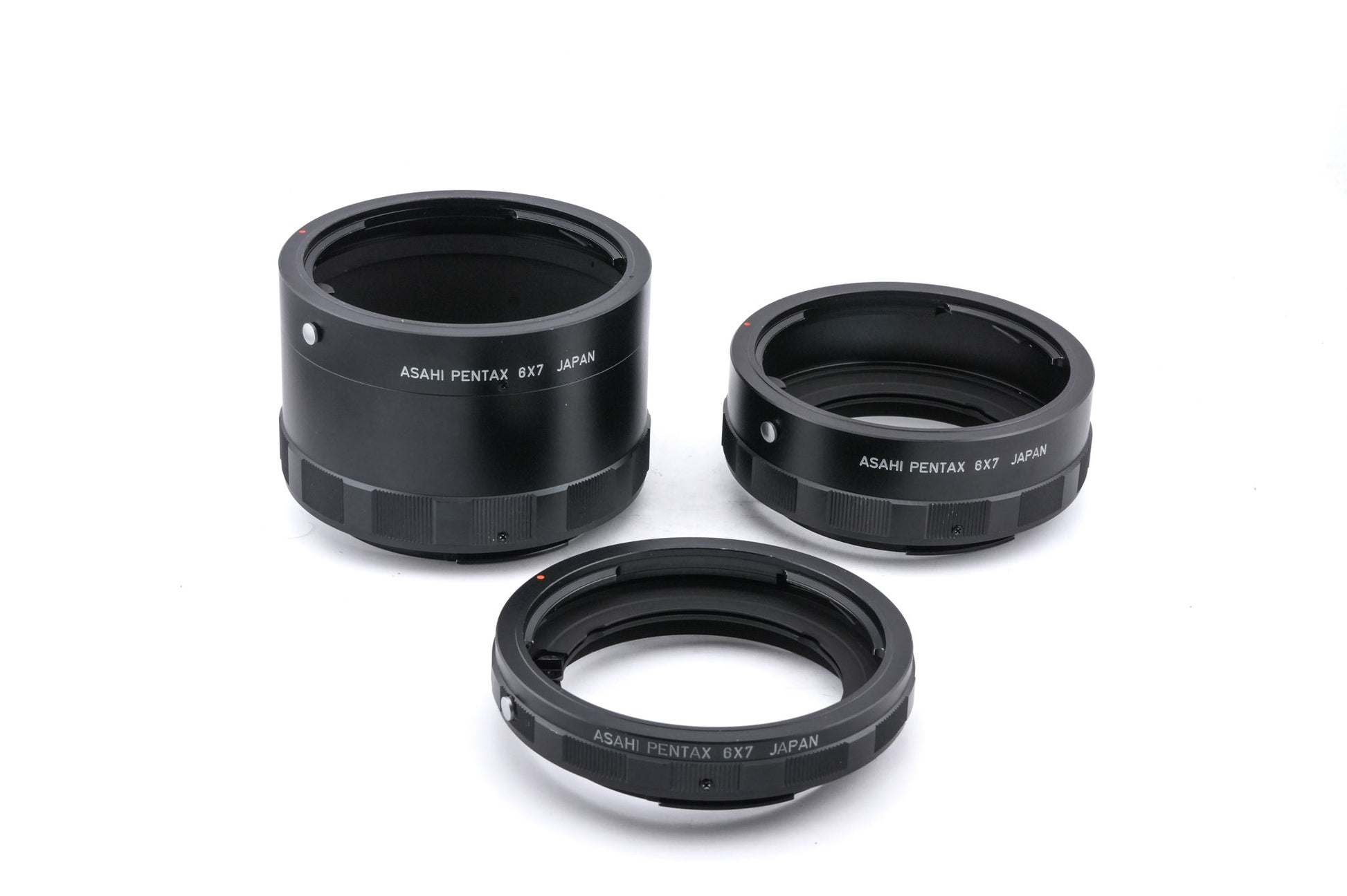 Extension tube set made for the Pentax 6x7 system introduced by Pentax. It consists of three rings with extensions 14mm, 28mm, and 56mm. They couple with the automatic diaphragm release for lenses up to 300mm. Metal body available in black.