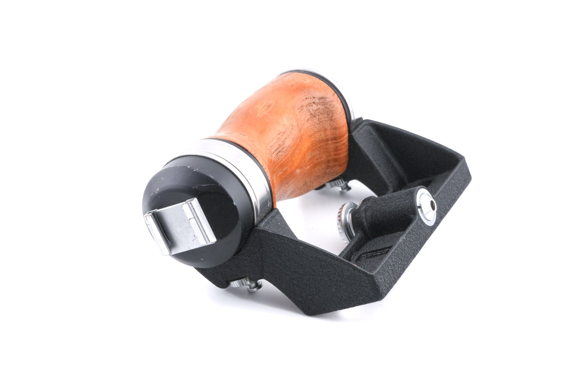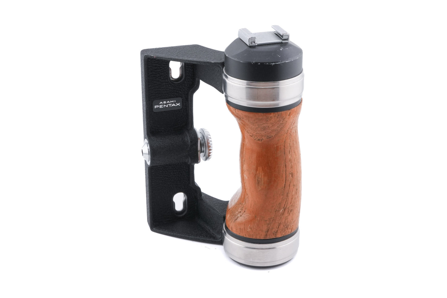 Wooden grip made for the 6x7, 67, and 67II cameras introduced by Pentax. At least two variations exist, one with a cold shoe and a later one with a hot shoe that connects to the camera body. Wooden and metal body available in black.