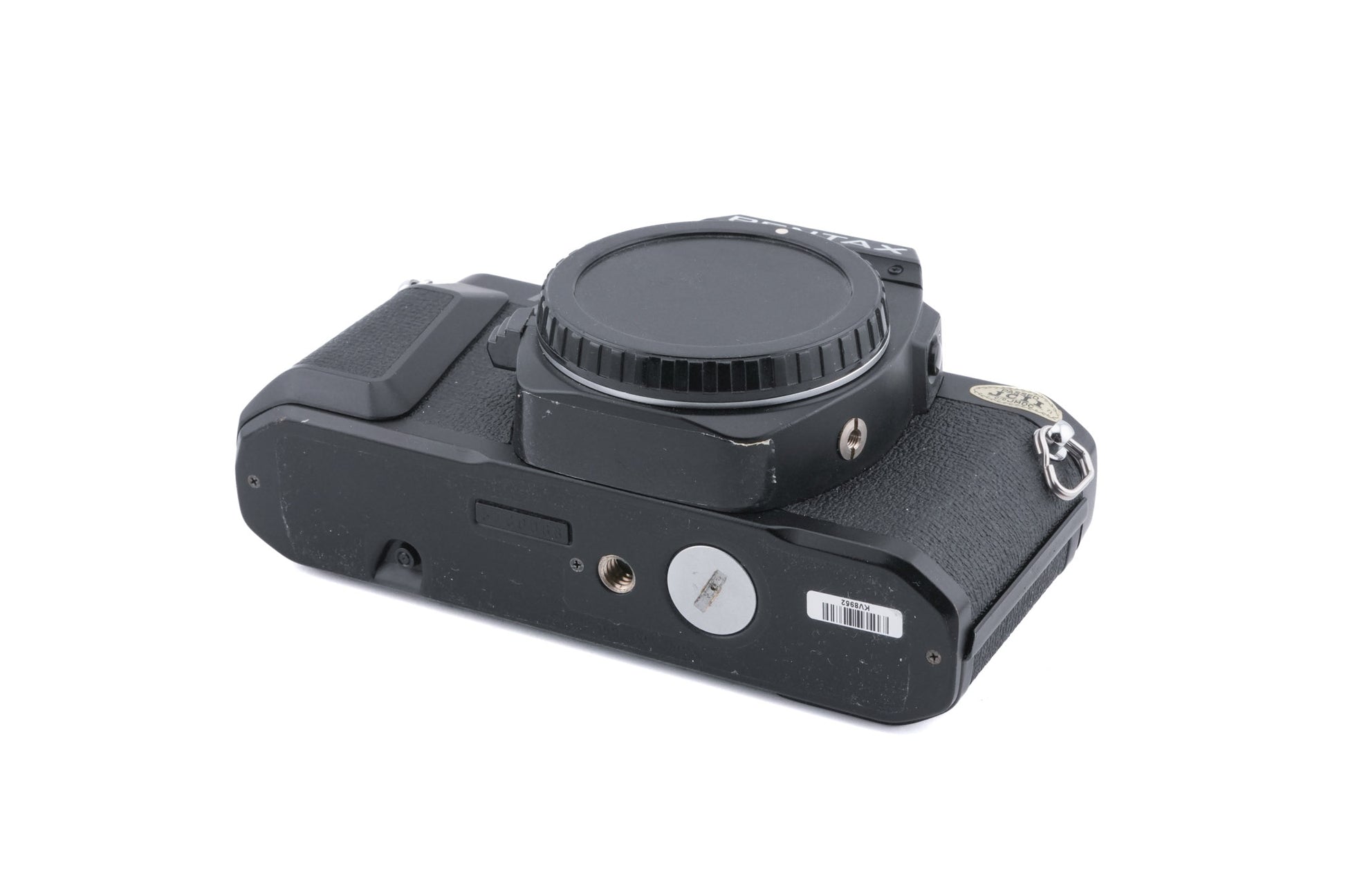 Manual focus K-mount 35mm SLR camera released by Pentax in 1985. It has program mode, aperture priority, and manual exposure. The ISO can only be set via DX code, there is no manual override. Plastic body available in black.