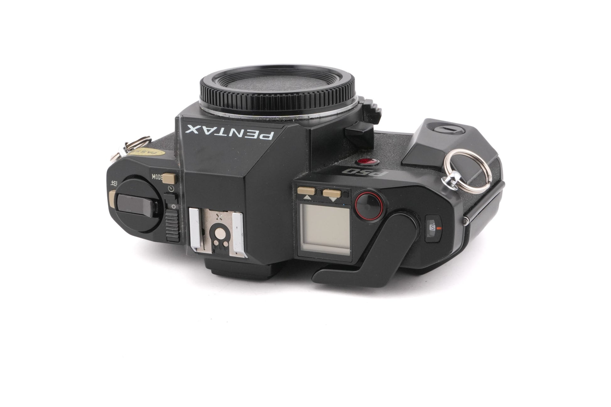 Autofocus Pentax K mount 35mm SLR camera released by Pentax in 1986. Known as the P5 in USA. Has electronically controlled fully automatic mode, aperture priority, and manual. The camera also has a self-timer and exposure compensation from -3EV to +3EV. Plastic body available in black.