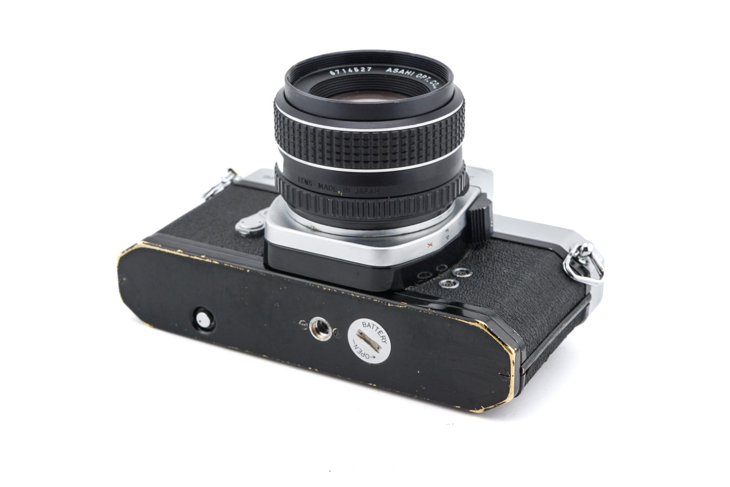 Manual focus M42 mount 35mm SLR released by Pentax. The light meter is tuned for a 1.35v PX400 mercury battery. Metal body available in silver & black.