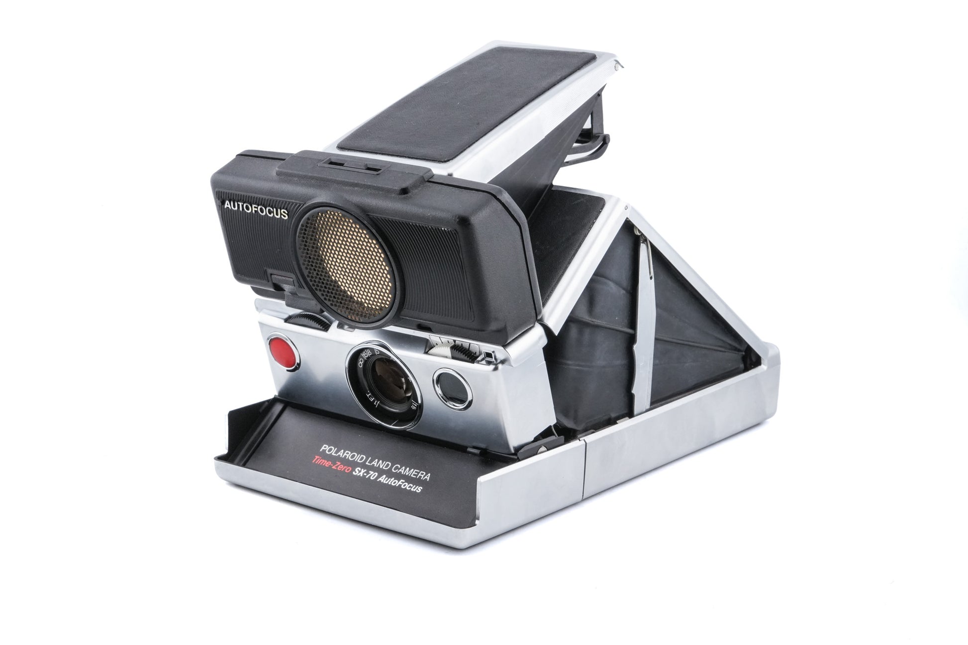 Autofocus SX-70 film folding SLR camera introduced by Polaroid in 1972. The Time-zero Autofocus variant has an autofocus attachment on it, allowing you to focus automatically with a light press of the shutter button. Metal body available in black and silver.