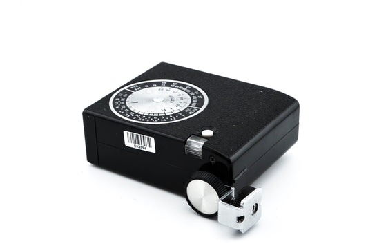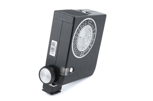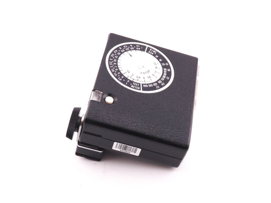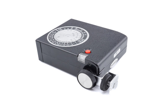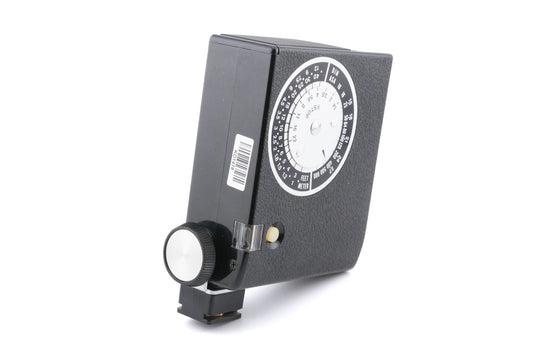 Flash made by Popular for all manual flash 35mm cameras with a PC sync port. It is a fully manual flash with guide numbers, distance/aperture scales, and an integrated PC cable. Plastic body available in black.