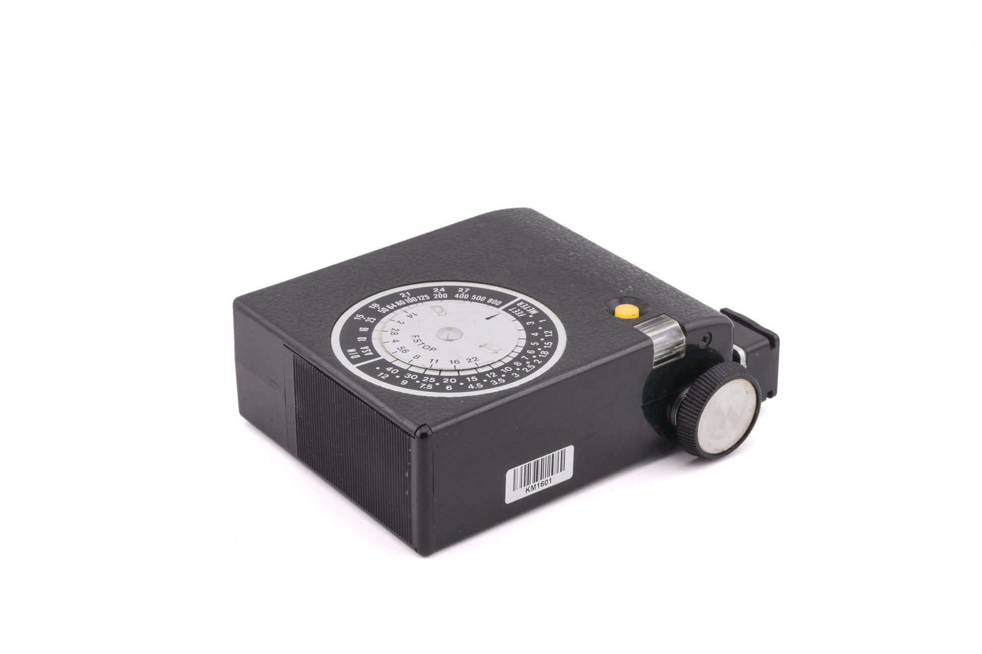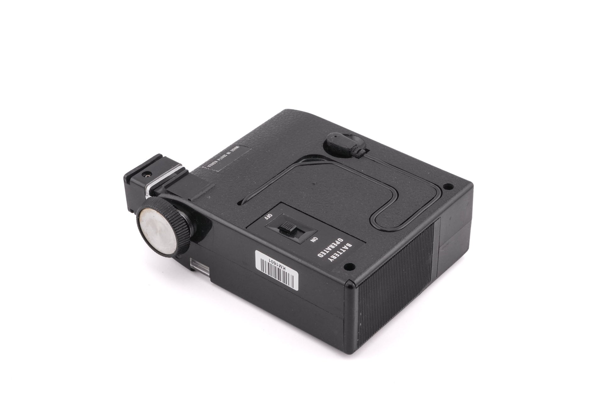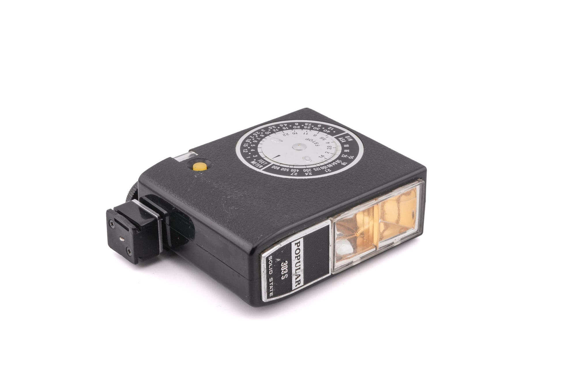 Flash made by Popular for all manual flash 35mm cameras with a PC sync port. It is a fully manual flash with guide numbers, distance/aperture scales, and an integrated PC cable. Plastic body available in black.