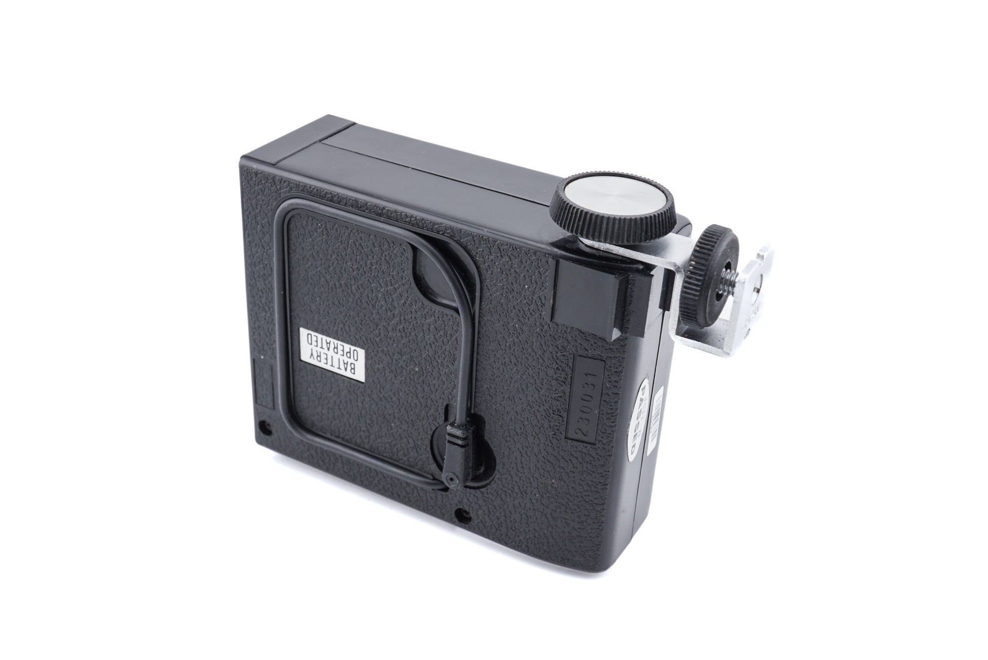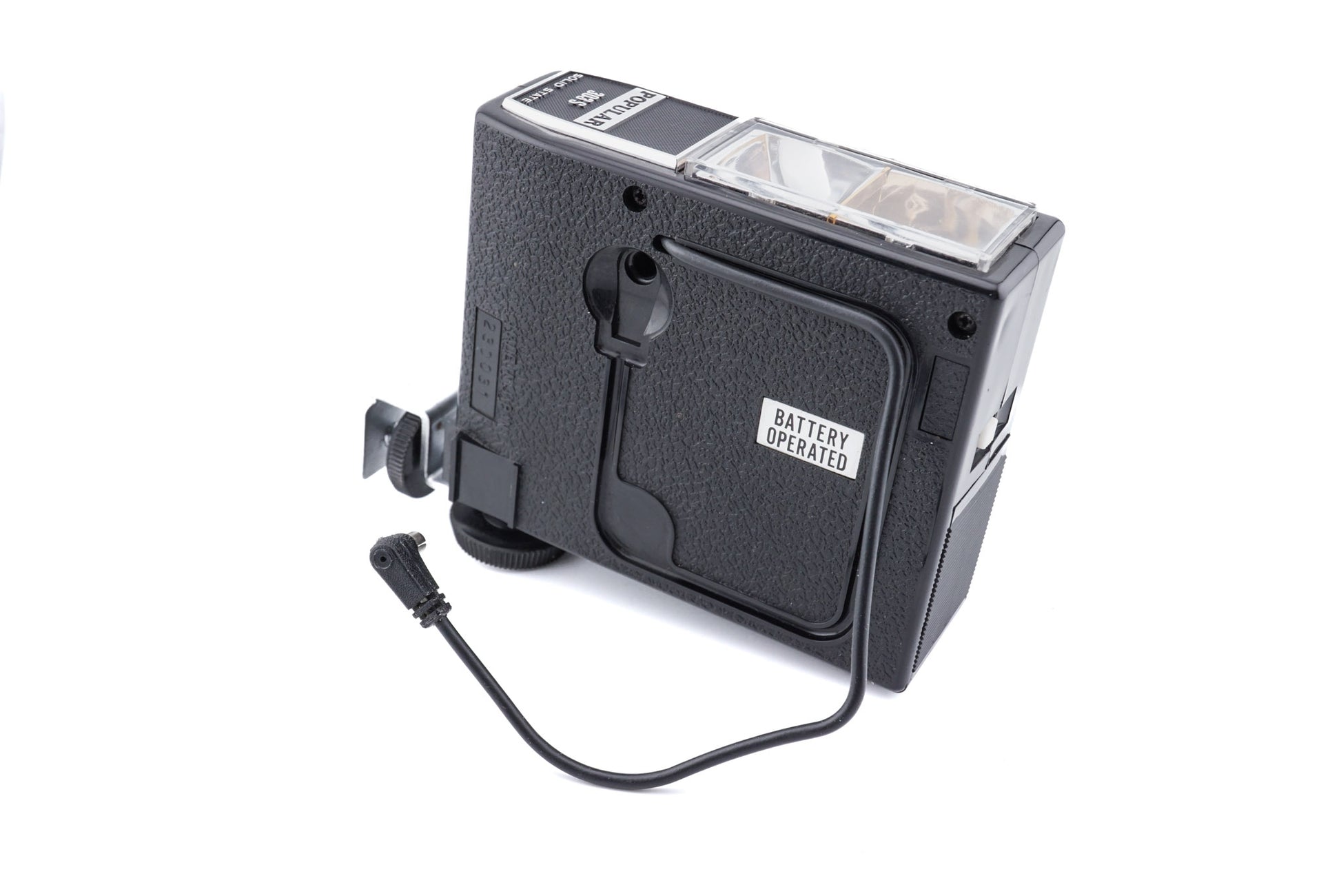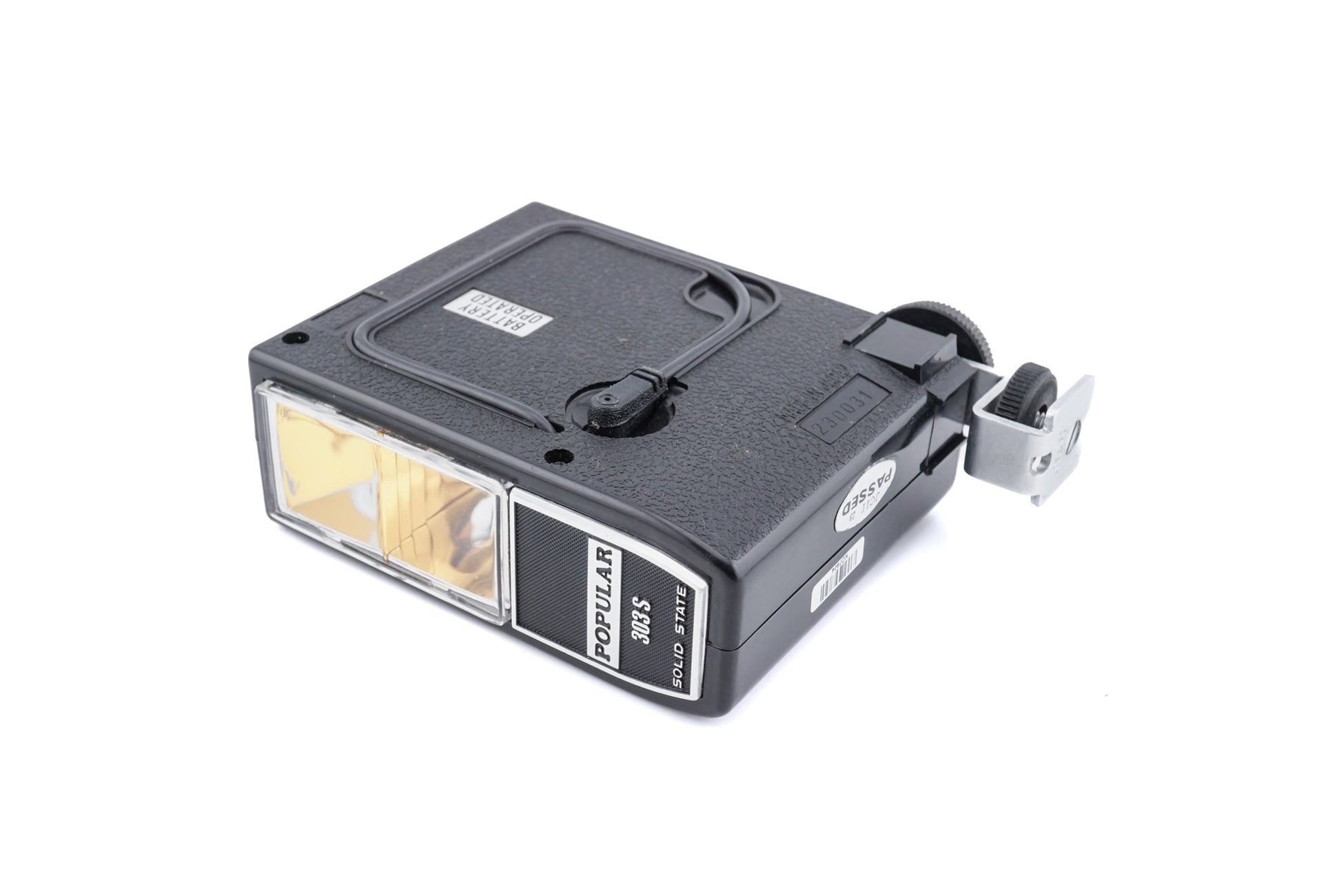 Flash made by Popular for all manual flash 35mm cameras with a PC sync port. It is a fully manual flash with guide numbers, distance/aperture scales, and an integrated PC cable. Plastic body available in black.